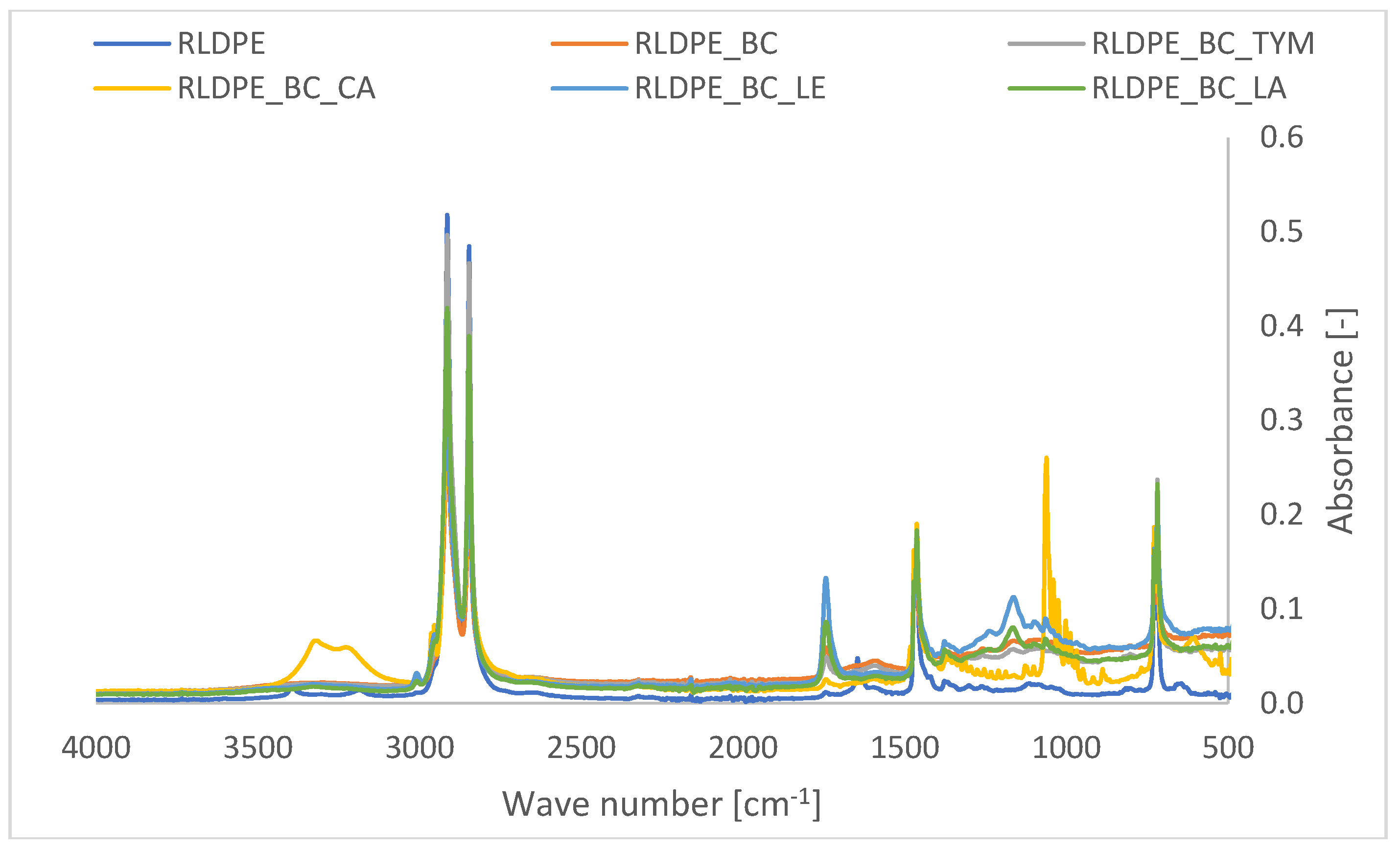 Figure 6). Neat RLDPE exhibits characteristic polyethylene absorption bands, including strong C–H stretching vibrations at 2915 and 2848 cm