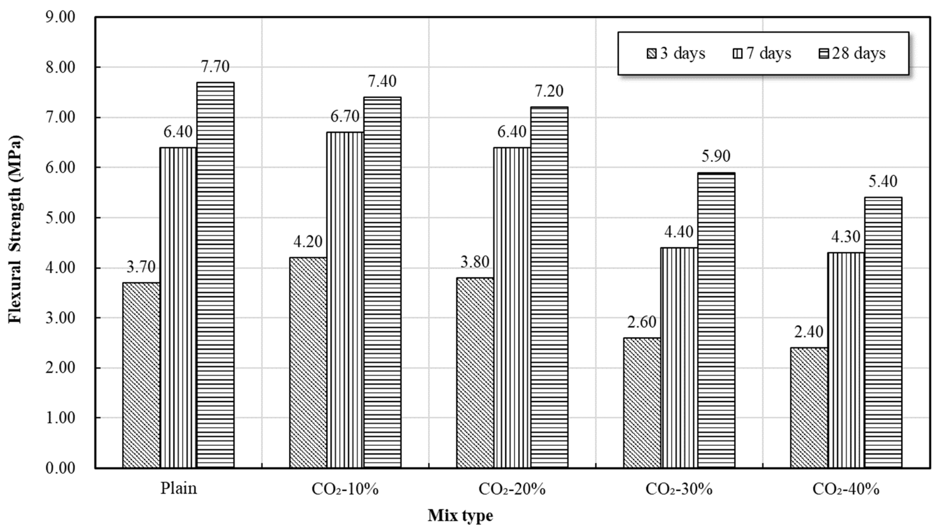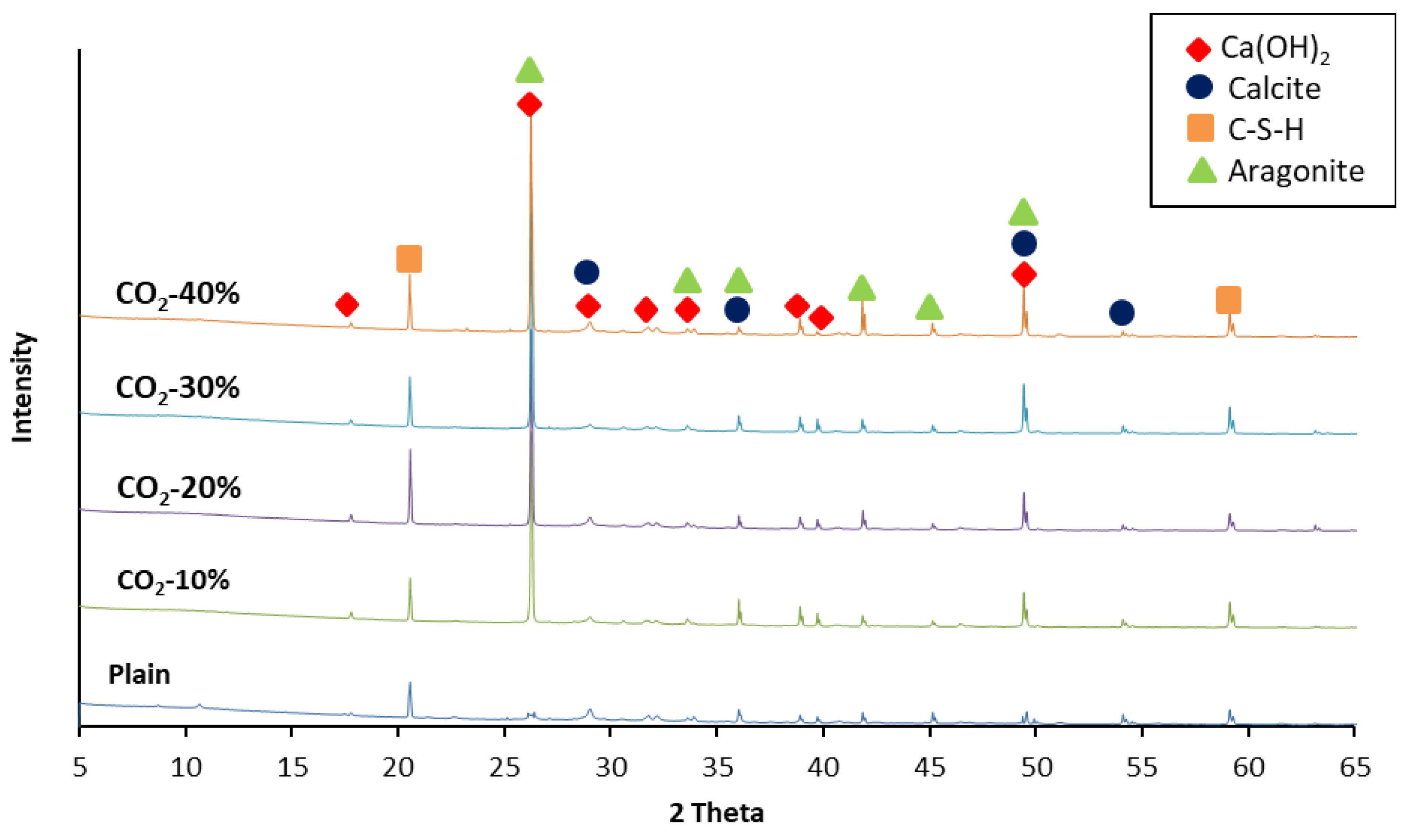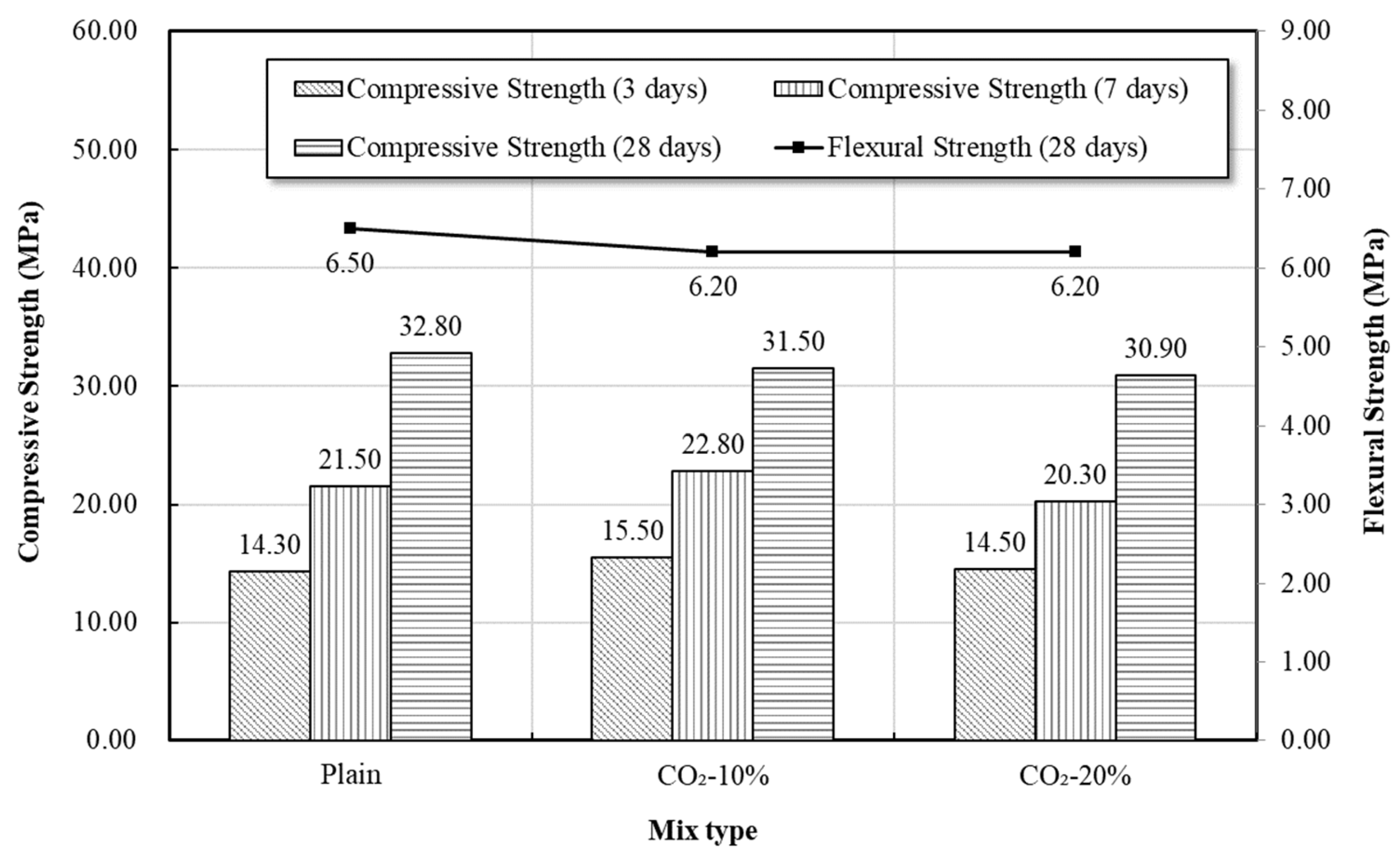 - Strength evaluation showed that CO2 absorbent replacement at 10–20% was associated with enhanced early-age strength compared to the Plain mixture. This behavior may be related to carbonate-based nucleation effects and the activation of GGBS in the presence of residual alkalinity. Conversely, replacement levels of 30% or higher were accompanied by reductions in compressive and flexural strength, which may be associated with carbonation-related microstructural changes, including partial C–S–H decalcification.
