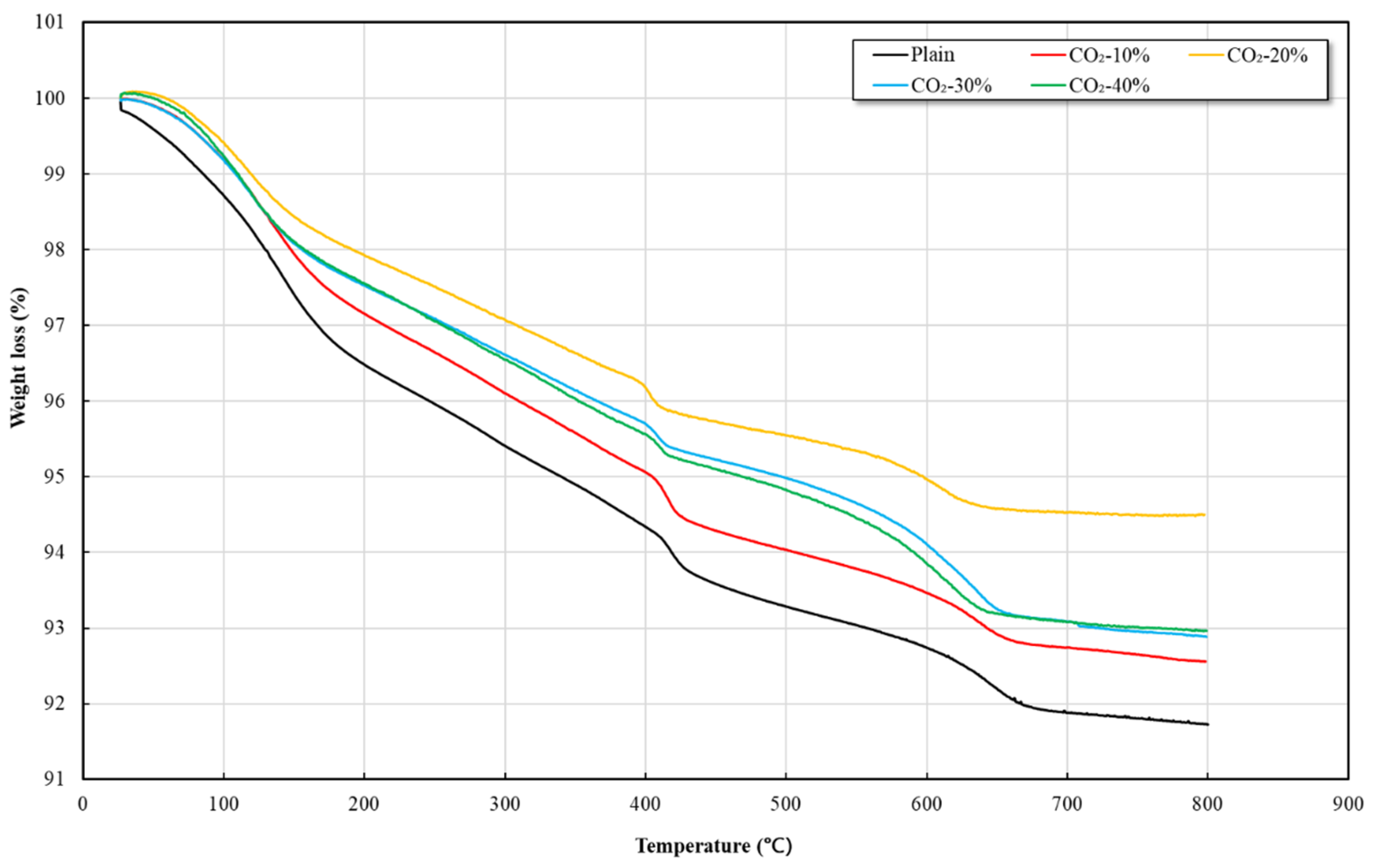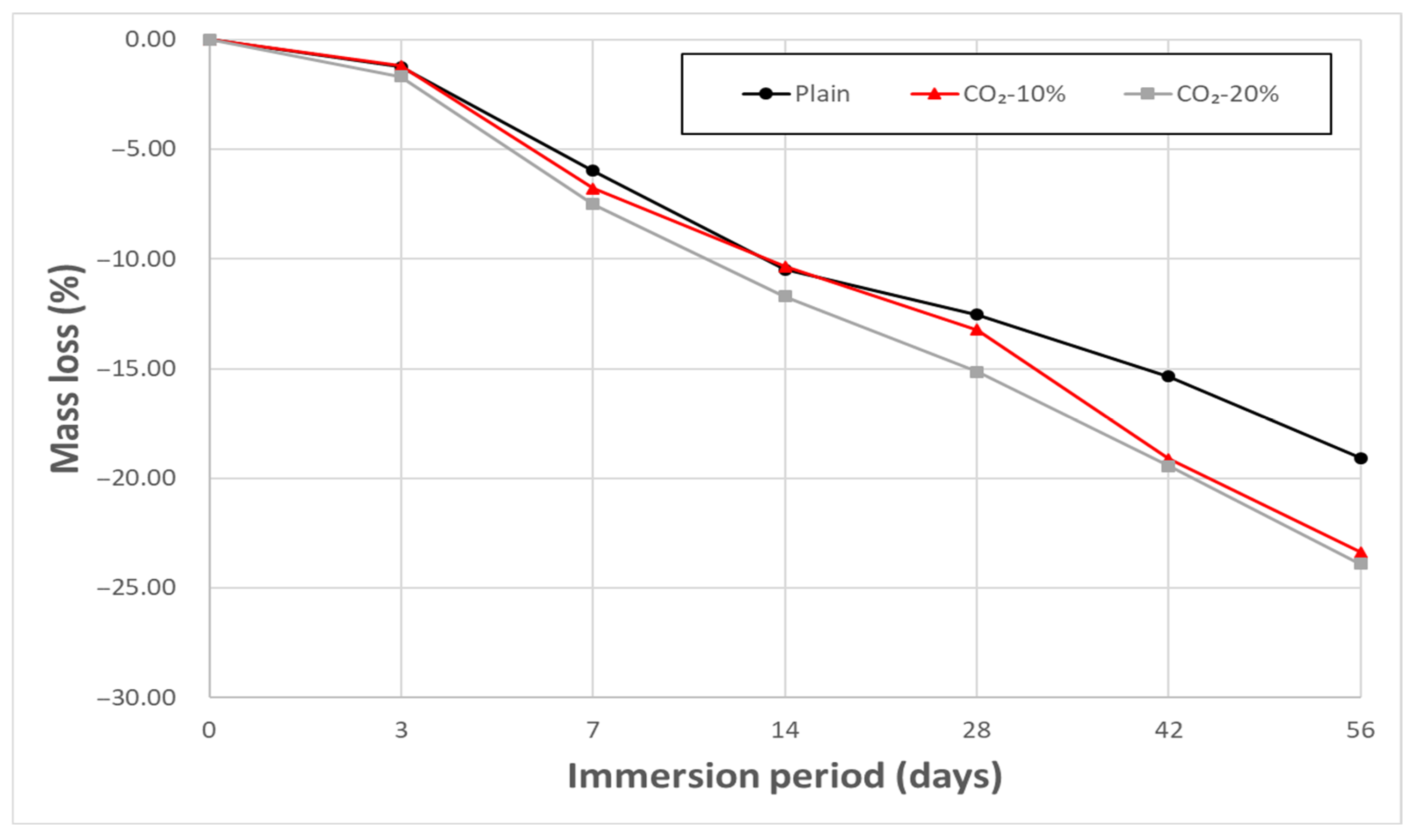 - Chemical resistance to strong acid solutions (5% HCl and 5% H2SO4) was slightly lower for CO2-replaced concrete compared to Plain. This tendency may be associated with acid dissolution reactions involving CaCO3, as well as the formation of soluble salts such as CaCl2, CaSO4, NaCl, and Na2SO4 originating from carbonation products and Na+ ions in the spent absorbent. Nevertheless, the increase in mass loss remained within a limited range, and mixtures with 10–20% replacement maintained a practically acceptable level of chemical resistance.