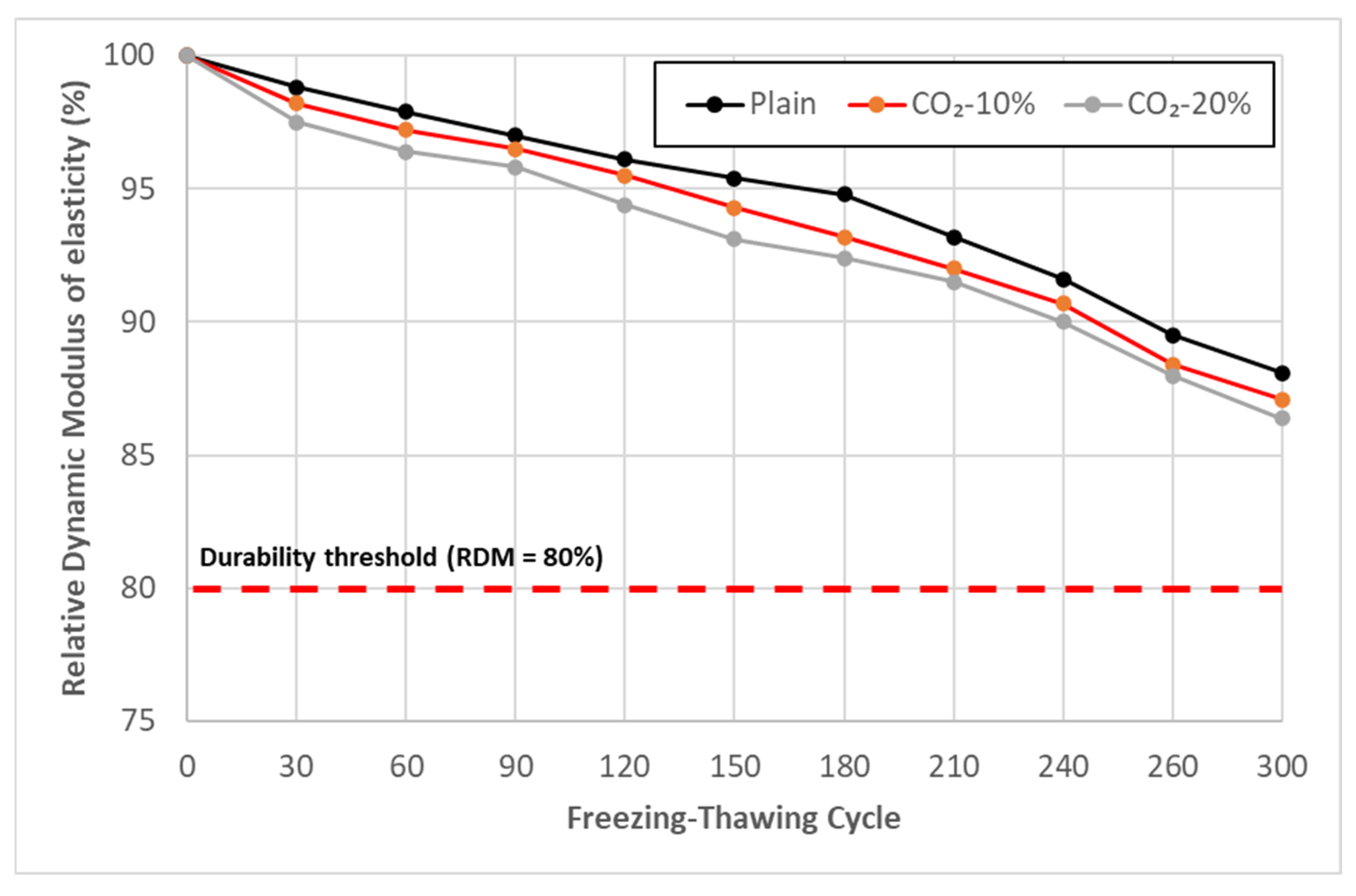 - In the durability assessment, CO2-replaced concrete exhibited freezing–thawing resistance comparable to that of the Plain mixture. Accelerated carbonation tests showed a tendency for carbonation resistance to decrease with increasing CO2 replacement ratio; however, at replacement levels of 10–20%, the carbonation depth remained within a range similar to that of Plain. These results suggest that, within this replacement range, durability performance was not critically compromised under the conditions investigated.