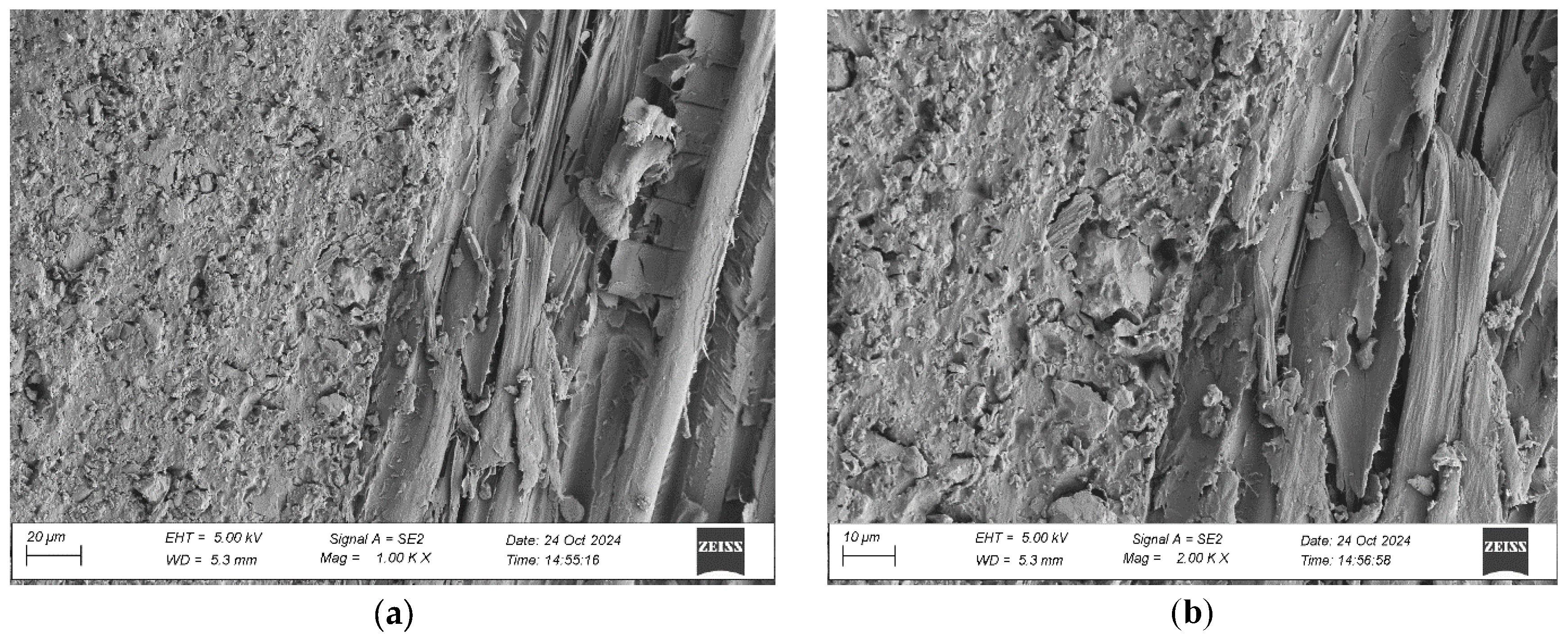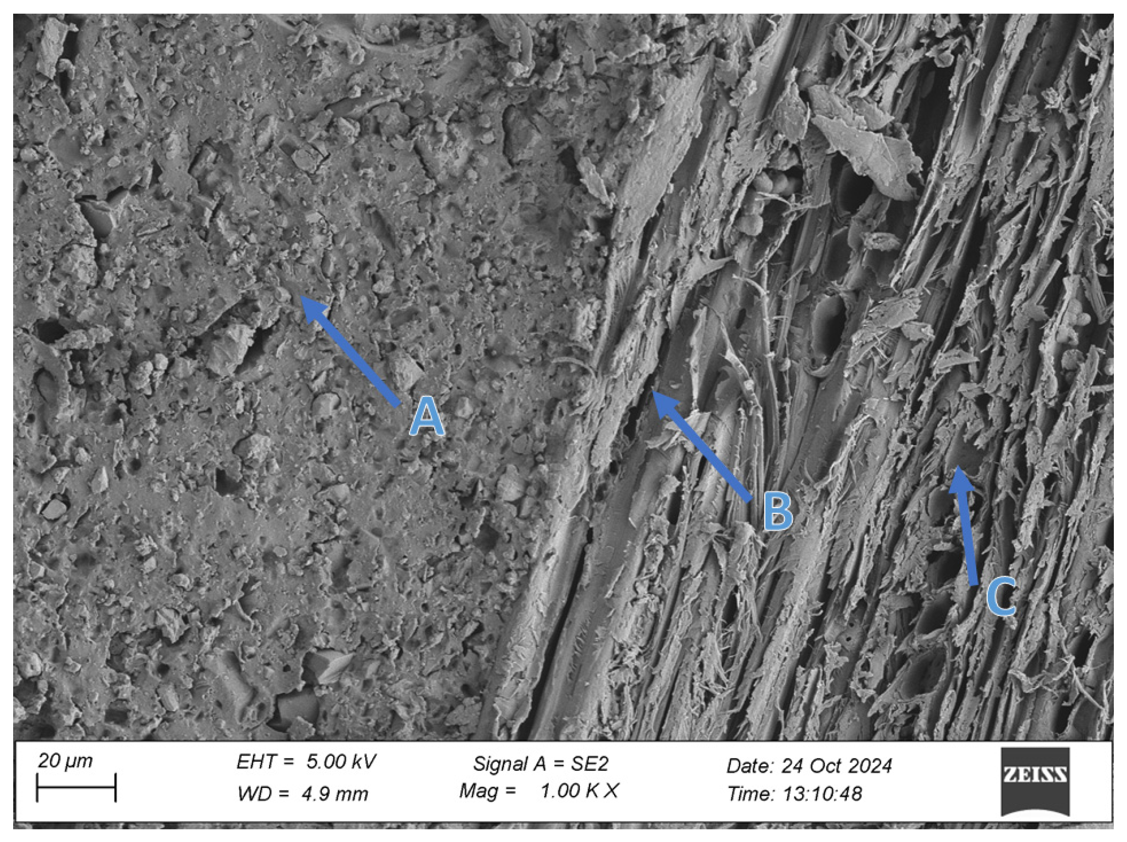 Wenge specimens exhibited sharply defined and structurally intact adhesive interfaces, with limited penetration into the wood matrix. This was expected, given wenge’s very dense and low-porosity anatomical structure. Despite moderate surface wettability and the lowest surface roughness among all tested species, no interfacial voids or delamination zones were identified. Interestingly, aged wenge samples showed substantial mechanical strength gains, suggesting that chemical bonding or improved polymer crosslinking may play a larger role than mechanical anchoring in this case. SEM observations confirmed the adhesive’s dimensional compatibility with the substrate and validated its long-term resilience in challenging bonding scenarios.