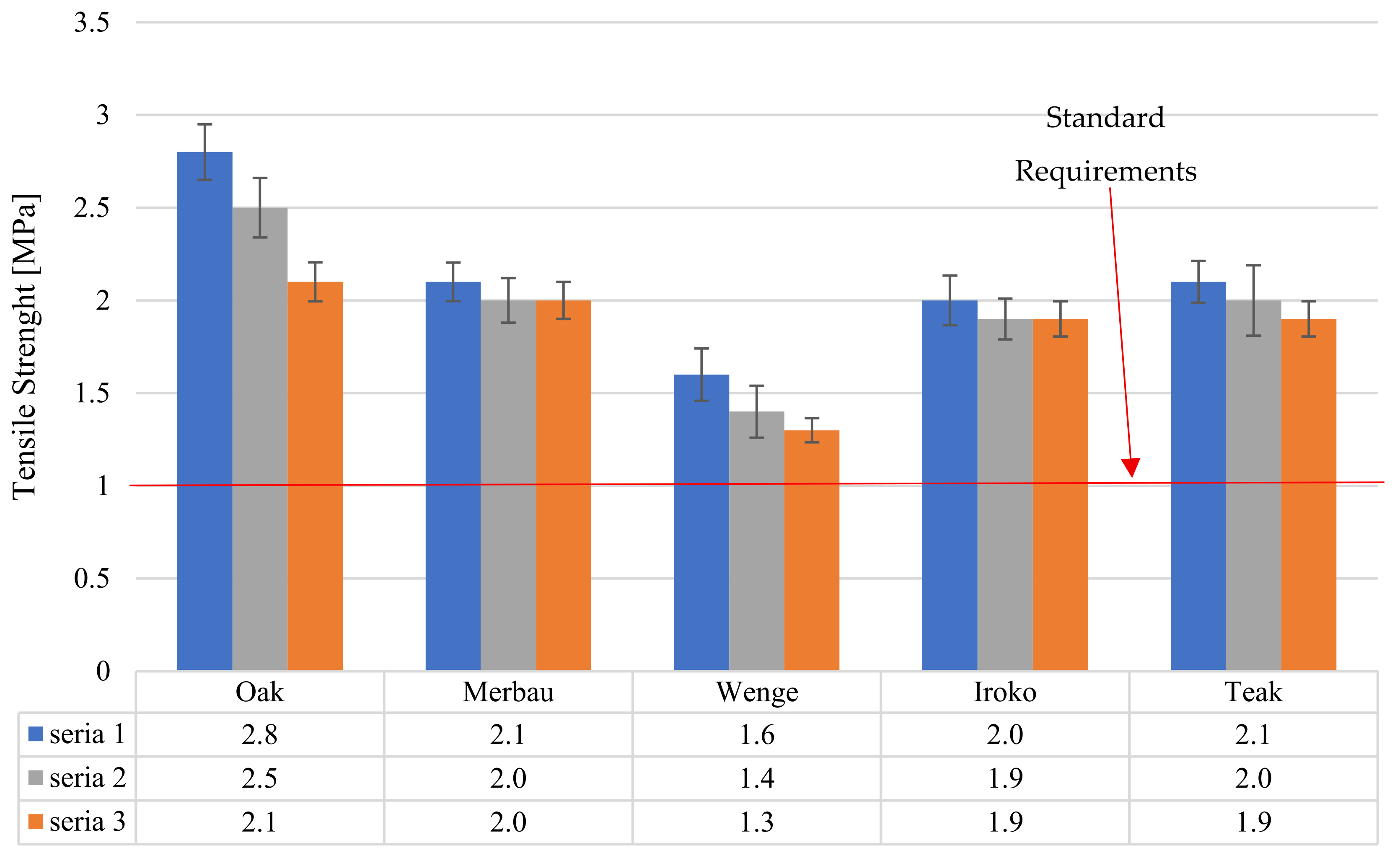 After 28 days of laboratory conditioning (Series 2), tensile strength slightly declined or remained stable: teak—2.0 MPa (−4.8%), iroko—1.9 MPa (−5.0%), and wenge—1.4 MPa (−12.5%). Series 3, which involved thermal aging, showed additional minor reductions: teak—1.9 MPa (−9.5% overall decline), iroko—1.9 MPa (−5.0%), and wenge—1.3 MPa (−18.8%).