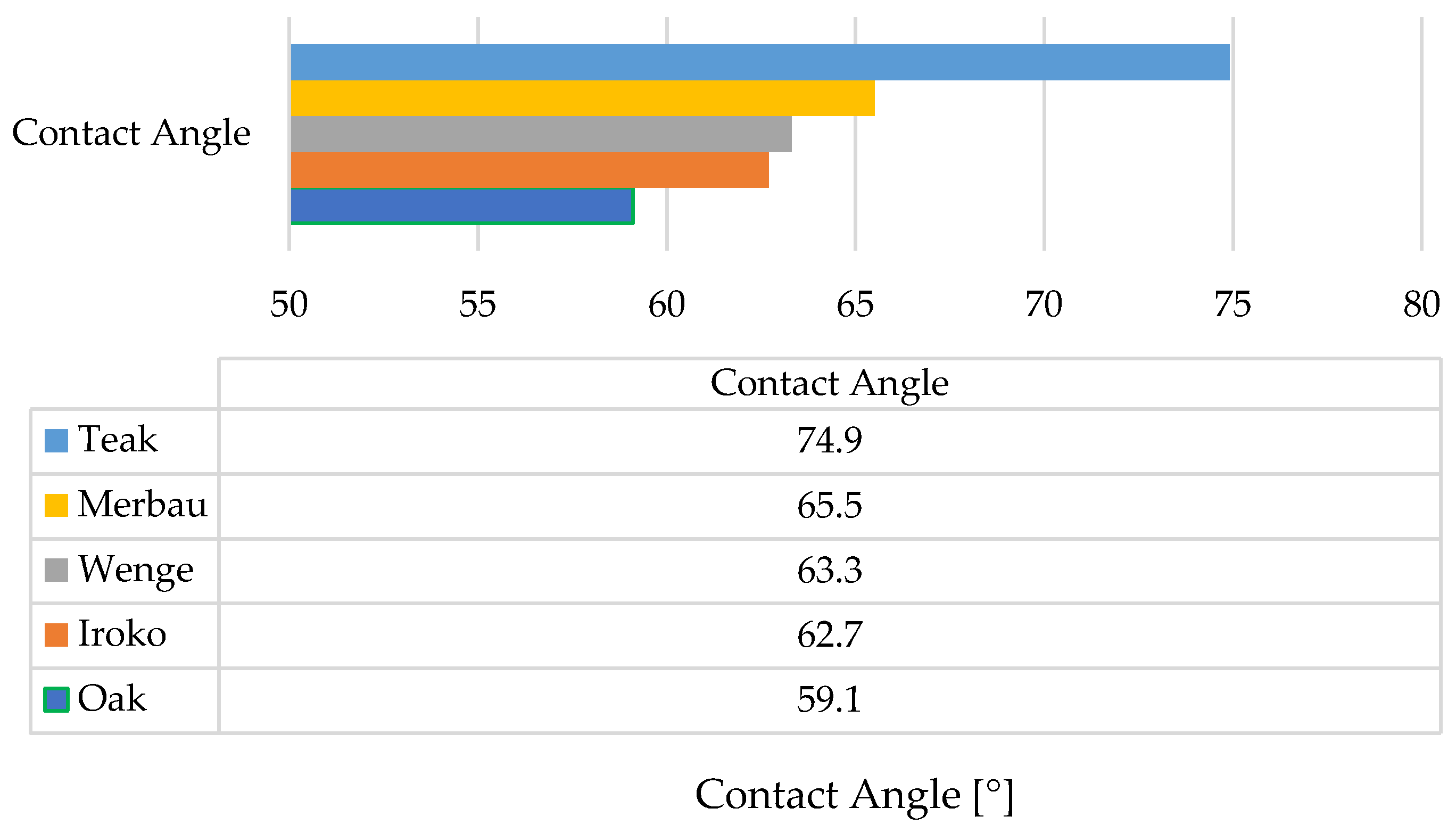 The wettability results align with known characteristics of the wood species studied. Teak exhibited the highest contact angle (74.9°), suggesting a more hydrophobic surface likely due to its natural oil content, as described by Yeh et al. [
