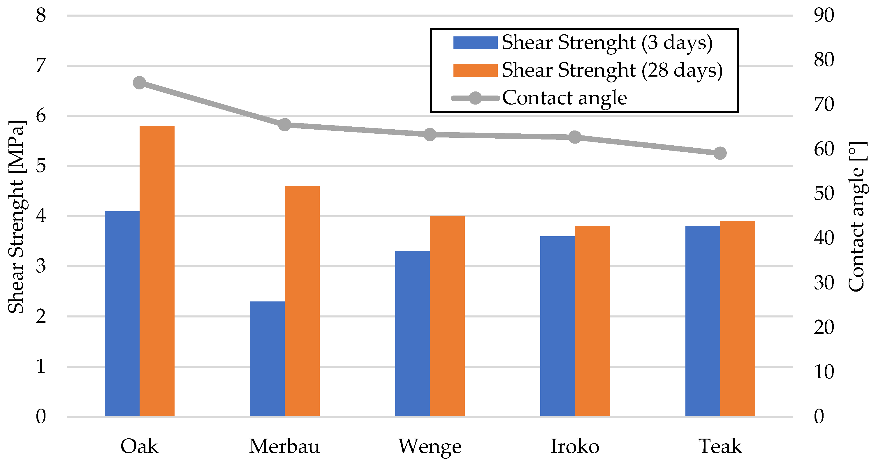 Figure 9 illustrates the correlation between average static contact angle and shear strength after laboratory conditioning. While oak and iroko, with low contact angles, achieved high shear strength, teak maintained strong bonding despite poor wettability due to mechanical interlocking effects.