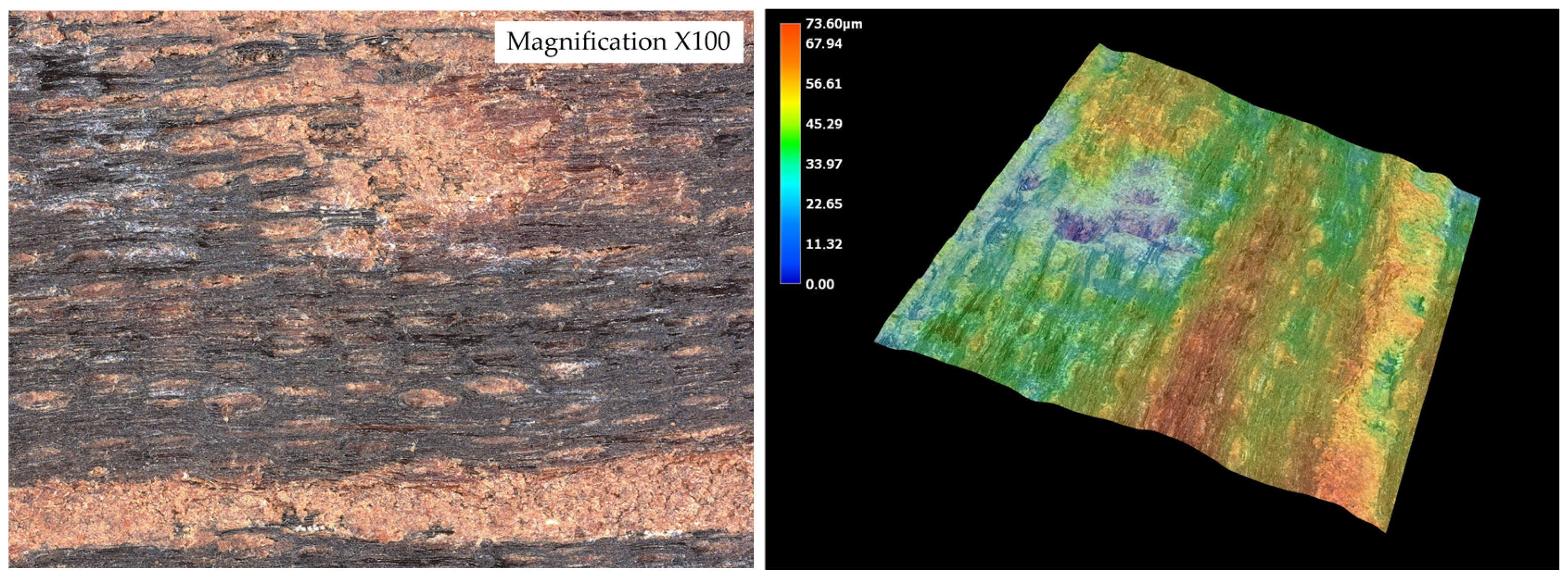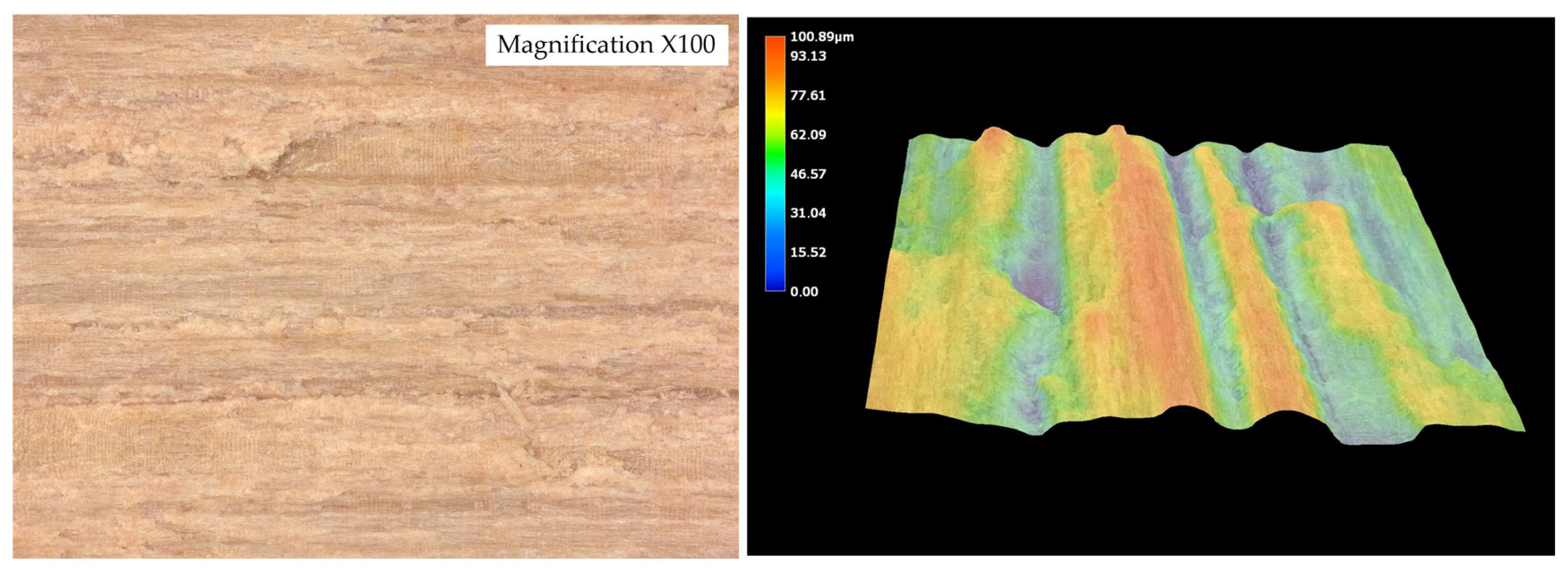 The surface roughness parameters obtained using optical microscopy revealed marked differences in surface topography among the tested wood species (