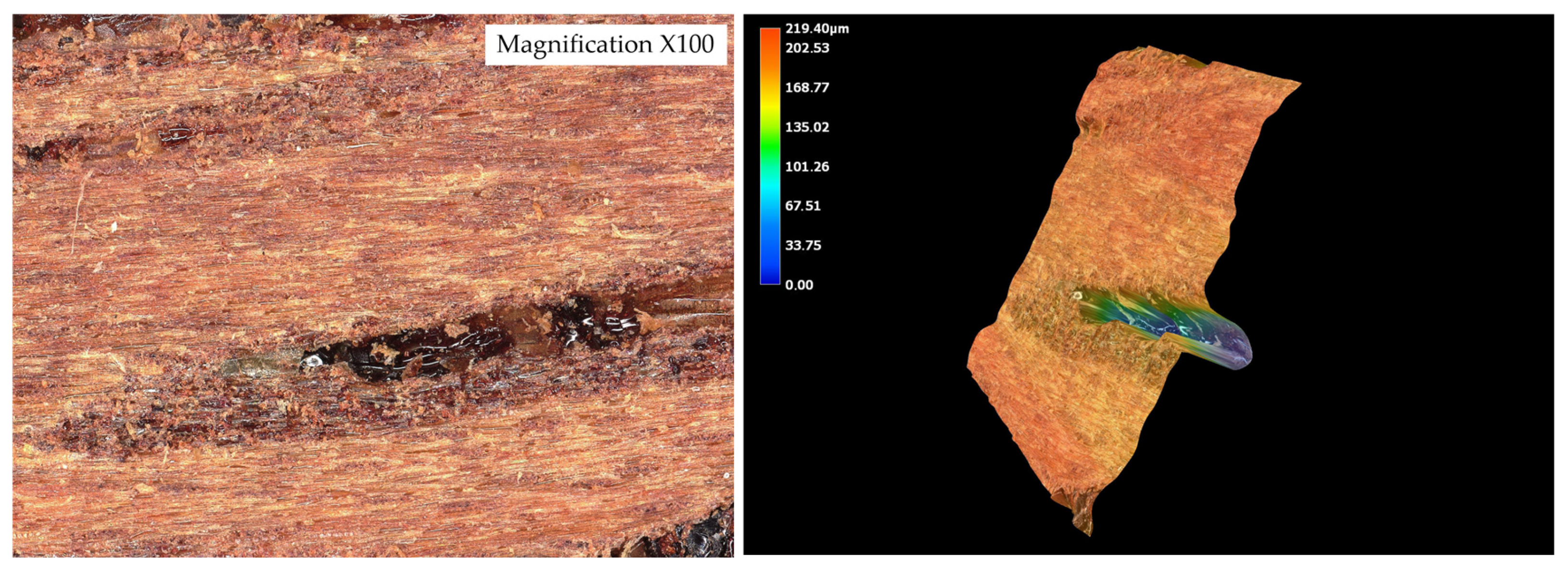The results are consistent with trends observed in mechanical testing: teak’s relatively poor wettability contrasts with its high initial mechanical performance, indicating that factors beyond wettability—such as microstructural interlocking or adhesive compatibility—also play major roles. Teak’s exceptionally high contact angle, in combination with its very rough and textured surface (as revealed in 3D optical microscopy), suggests that mechanical interlocking compensates for limited adhesive wetting. Despite low surface energy, the physical retention of adhesive within deep surface irregularities may promote effective bonding, particularly in shear.