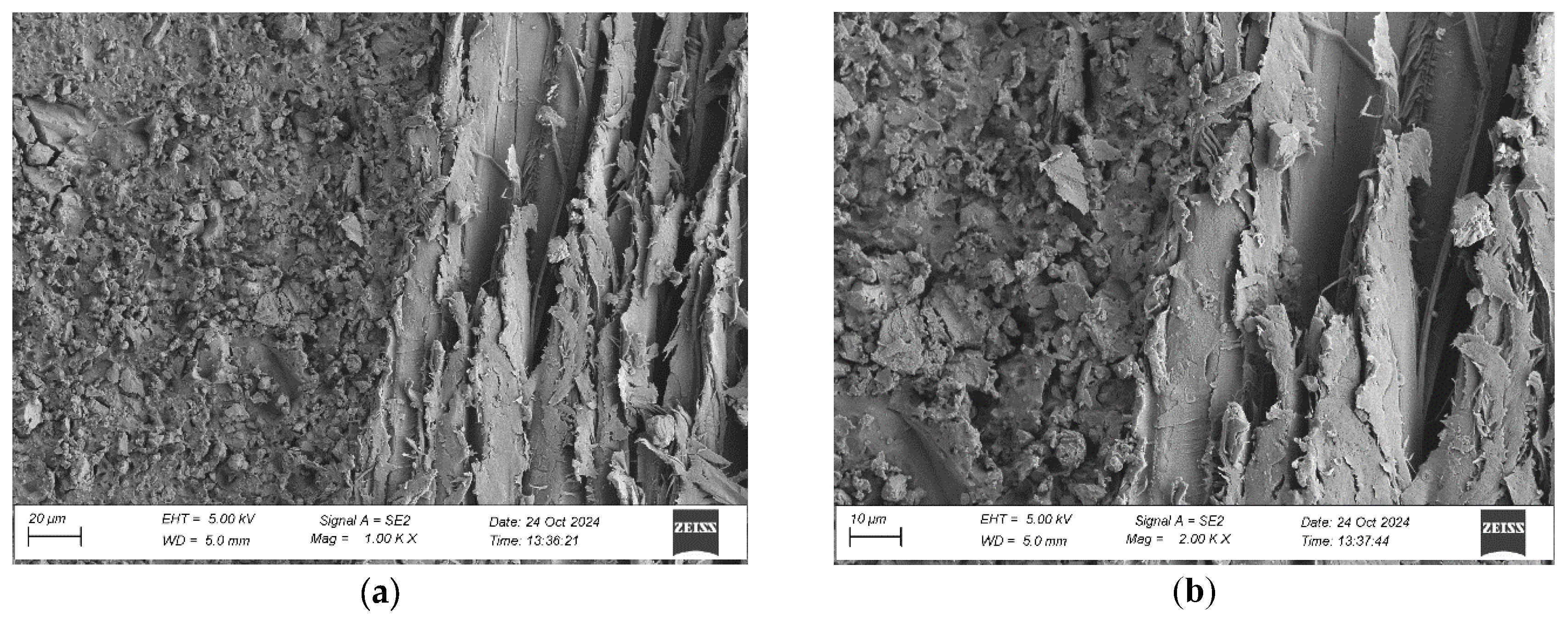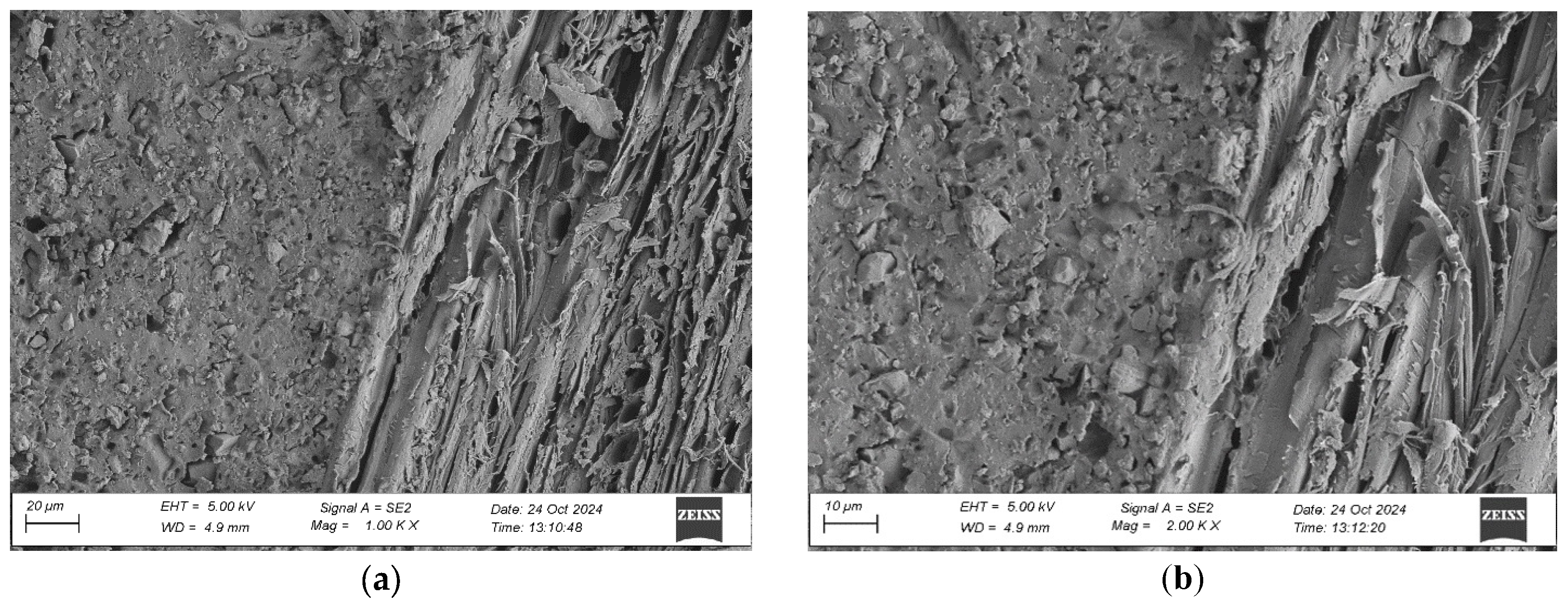To evaluate the microstructure of adhesive joints, scanning electron microscopy was performed using a Carl Zeiss Sigma 500 VP SEM (Oberkochen, Germany) with a field emission gun (FEG) for high-resolution imaging. All specimens were gold-sputtered to enhance conductivity prior to imaging. Observations were conducted at accelerating voltages of 5 keV using secondary electron (SE) detection. SEM observations included adhesive cross sections in the wood–adhesive–wood systems for five types of wood under two conditions:
