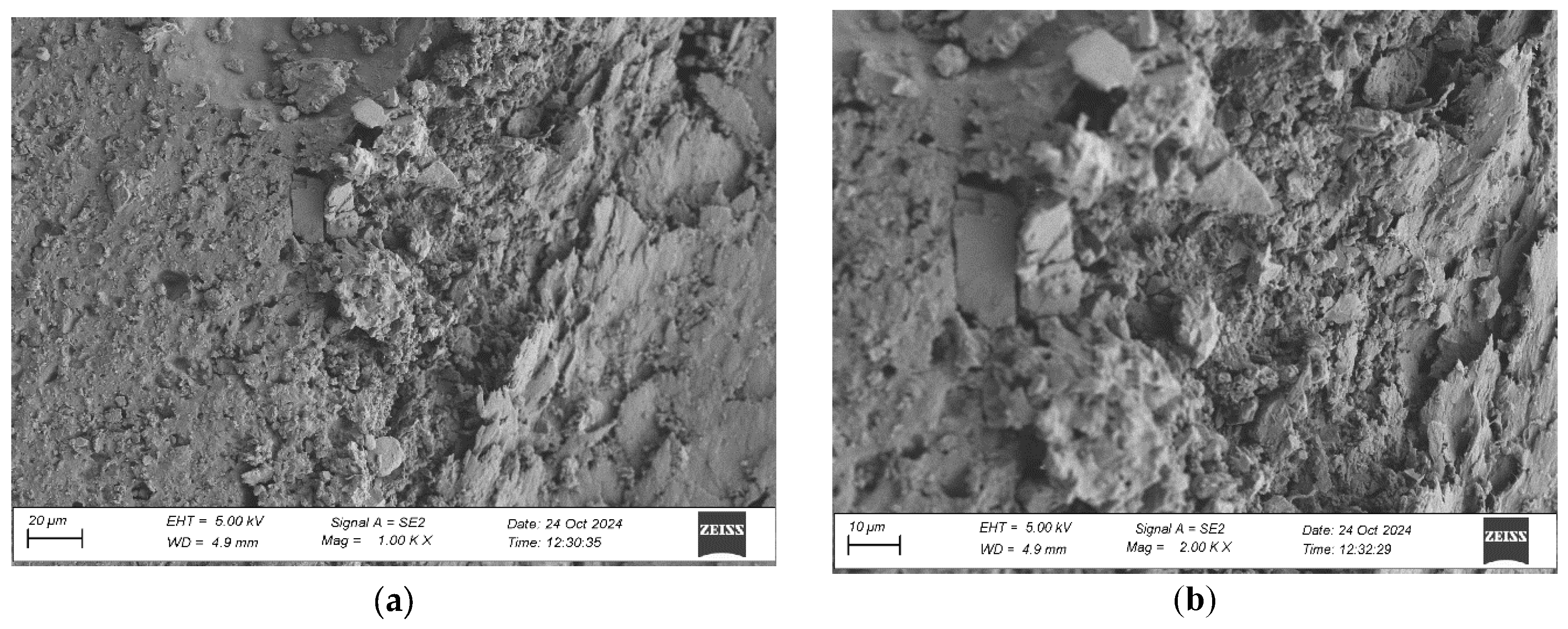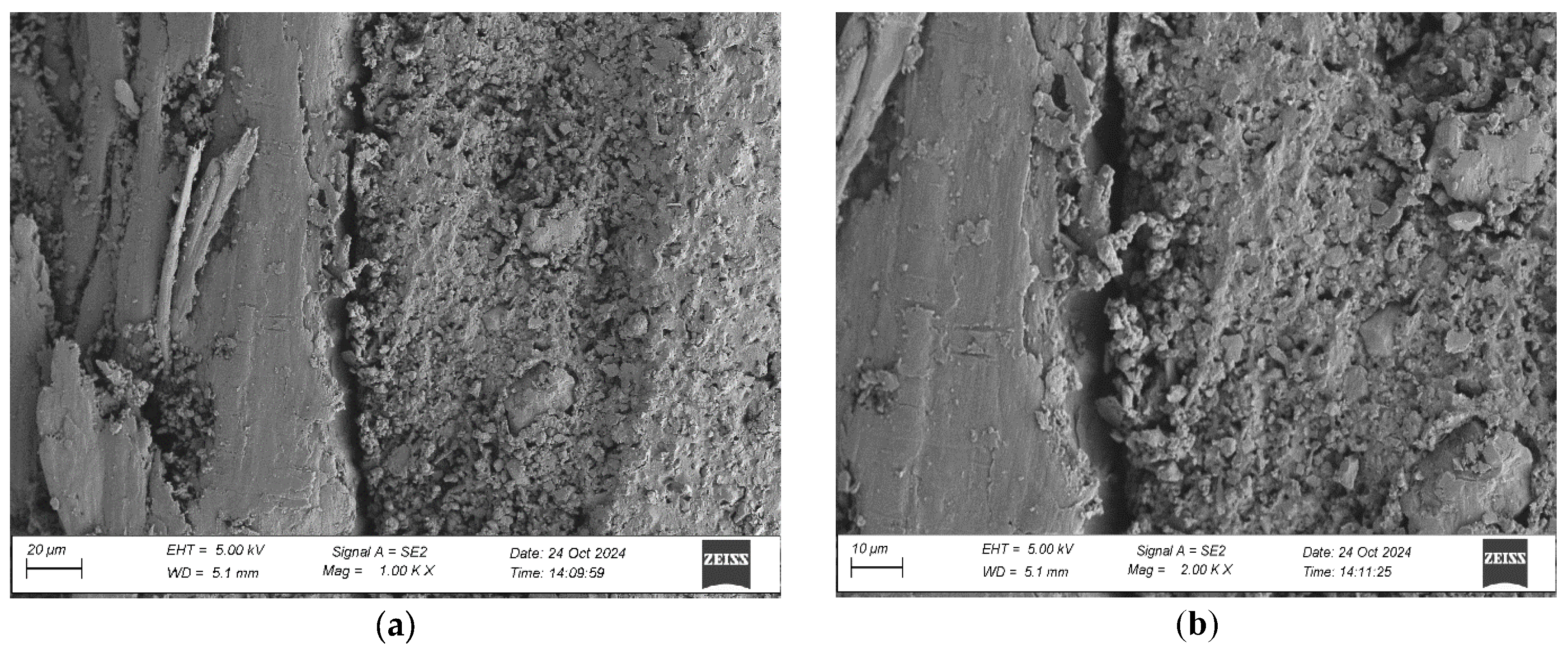 Images were captured at magnifications of 100×, 500×, 1000×, and 2000× to evaluate adhesive penetration, pore formation, and interfacial interactions. The results provided essential data on adhesive behavior at the microscopic level, including insights into porosity, phase boundaries, and structural integrity post-aging. An exemplary description of the SEM images has been provided for the selected micrograph, in this case for oak. The same procedure was applied to all other SEM images (