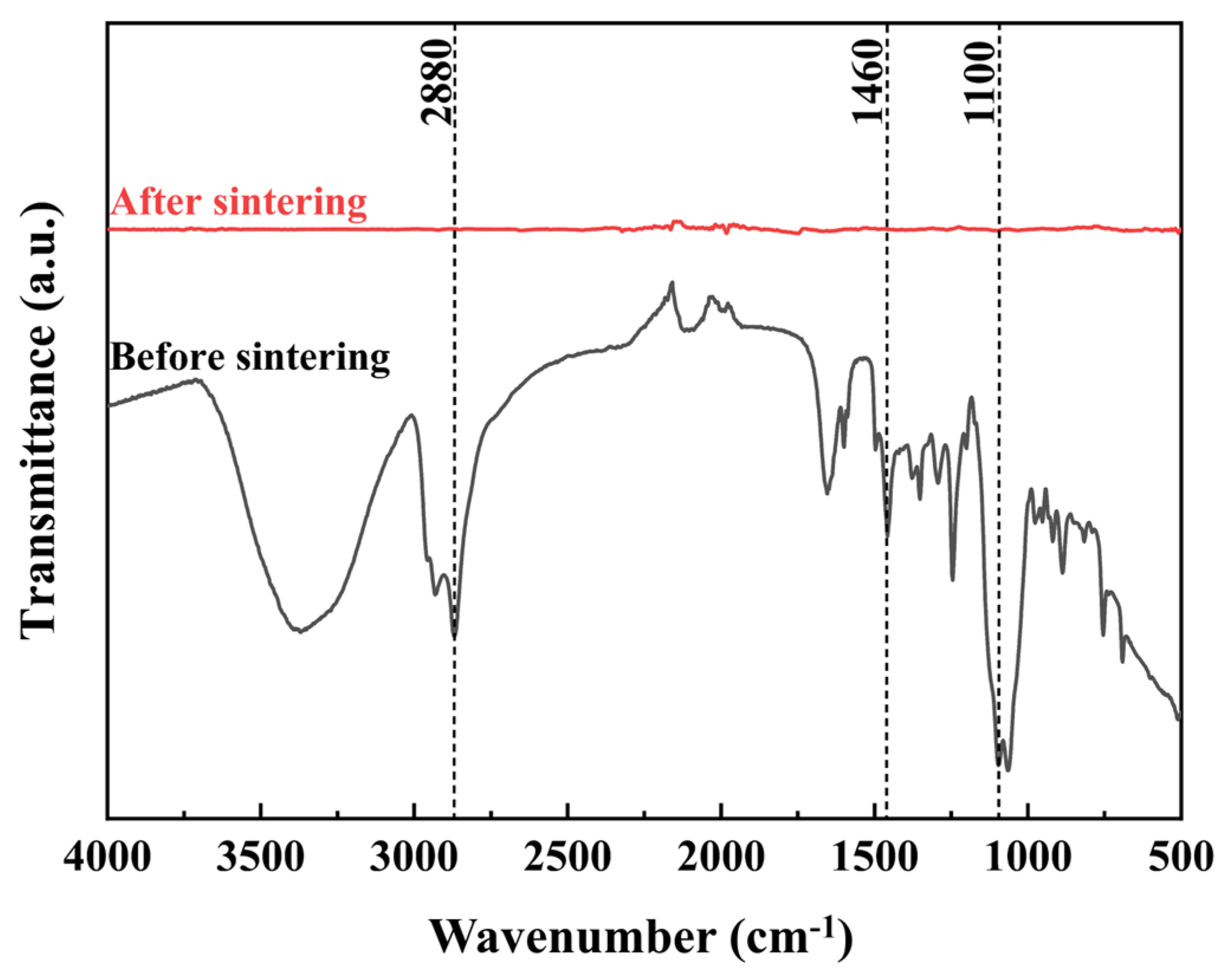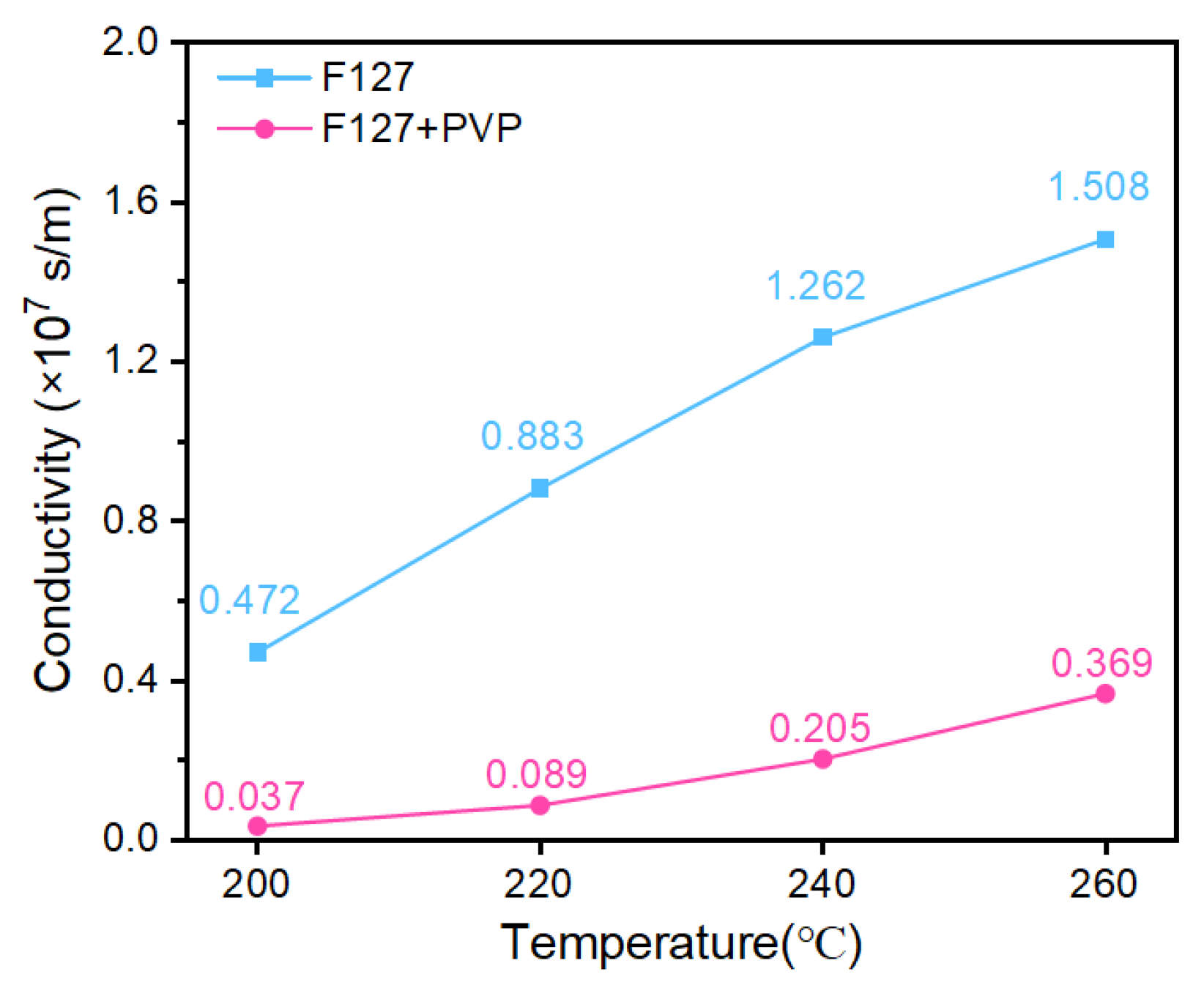 - The key to achieving high conductivity lies in the selection of Pluronic F127 as the sole dispersant. It provided exceptional steric stability, and crucially, its relatively low decomposition temperature (~322 °C) allowed for near-complete removal during the 260 °C sintering process. This enabled extensive particle fusion into a dense network, yielding a high conductivity of (1.506 ± 0.08) × 107 S/m (on glass/PI substrates) with 10 wt.% F127.