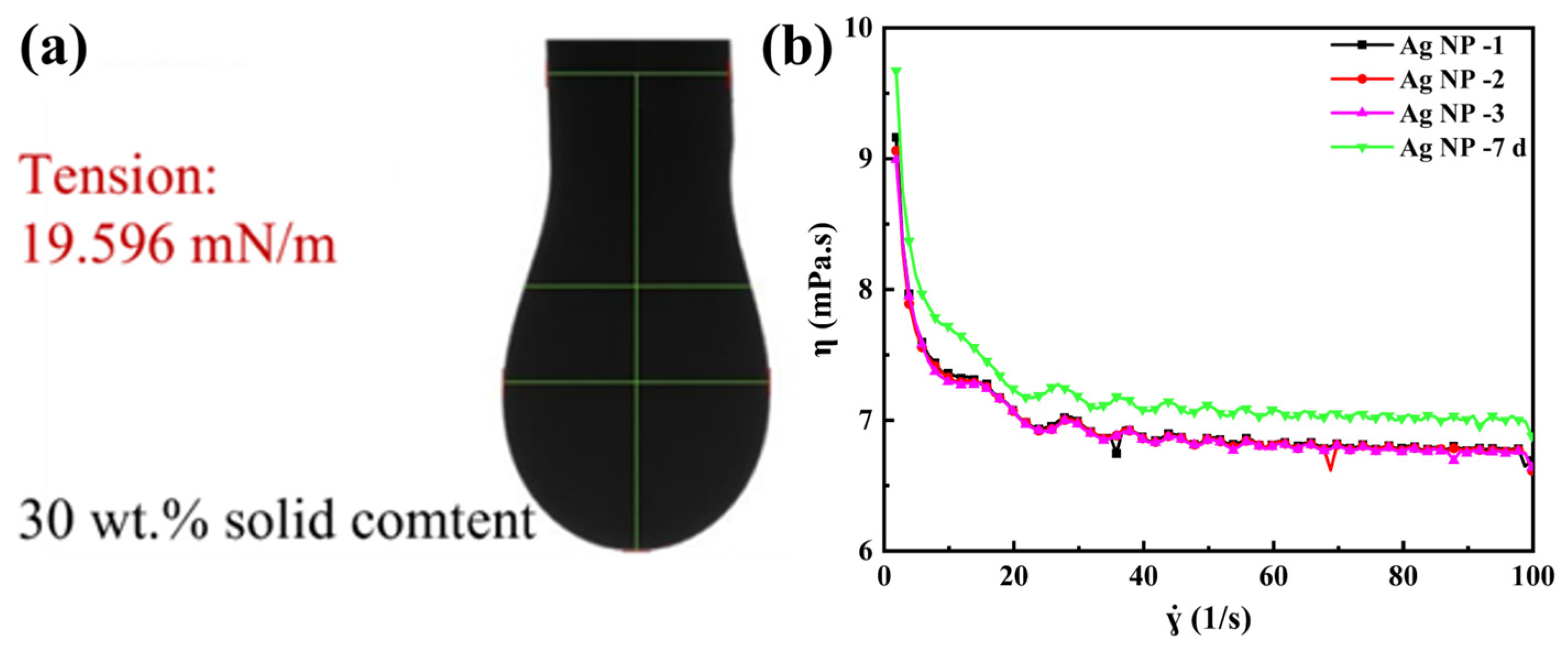 - The resulting optimized Ag NP ink demonstrated excellent jetting stability (clogging-free) and suitable rheology for reliable inkjet printing.