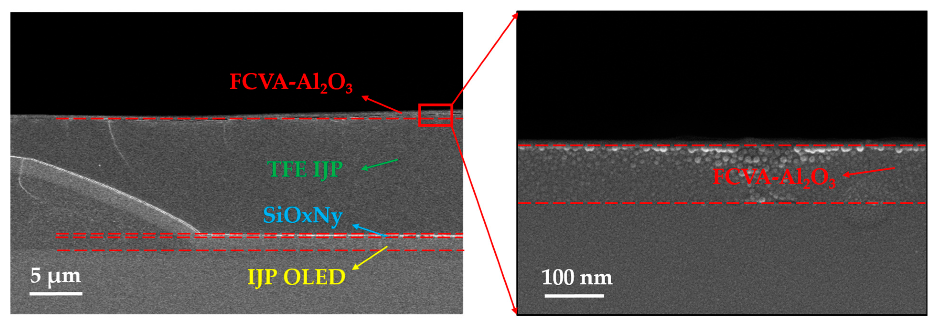 - Yuan, H.; Li, Q.; Yan, W.; Zhang, Y.; Chen, L.; Pan, P.; Luo, J.; Liao, B.; Ouyang, X. A novel and efficient technology of depositing Al2O3 film for OLEDs thin film encapsulation. Vacuum 2022, 196, 110741. [Google Scholar] [CrossRef]