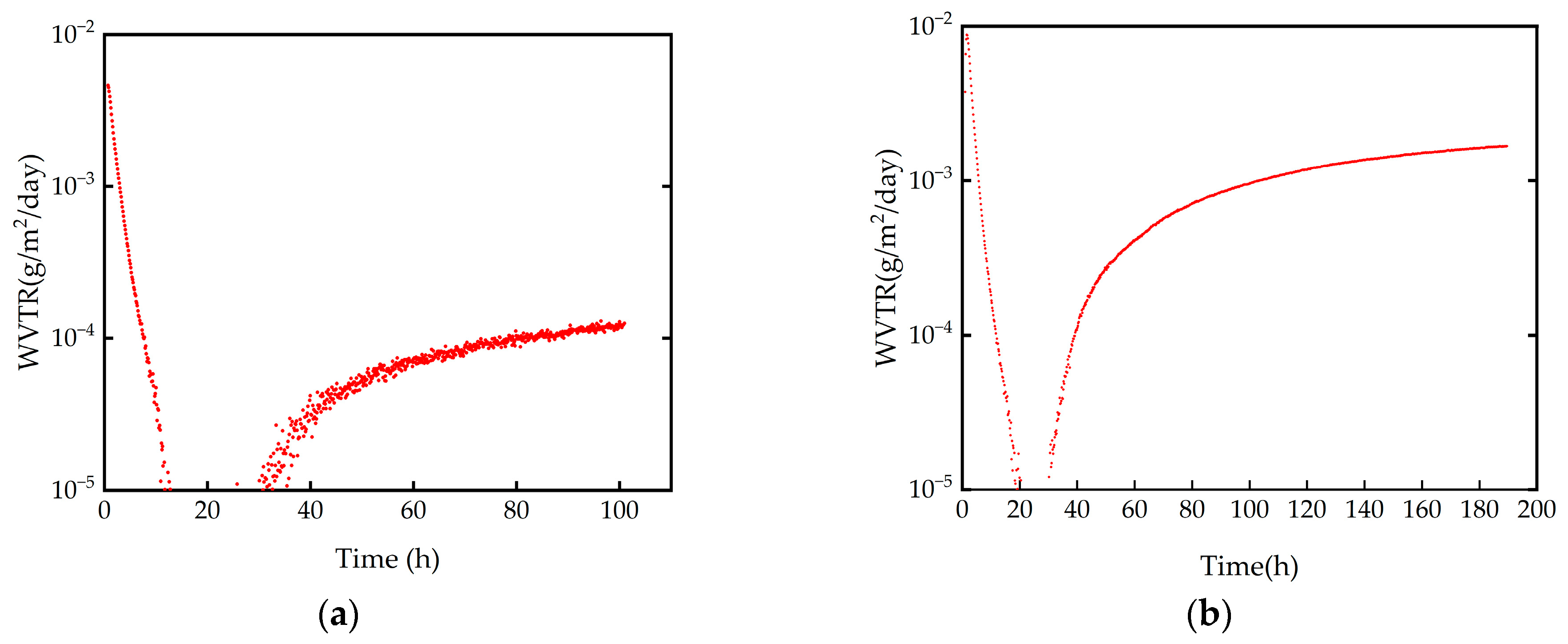 | Water Vapor Transmission Rate (g/m2/day) | 1.2 × 10−4 | 1.6 × 10−3 |