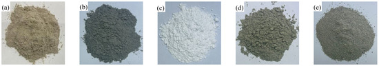 Photographs of raw materials: (a) WCP; (b) FA; (c) GGBFS; (d) OPC; (e) SAC.