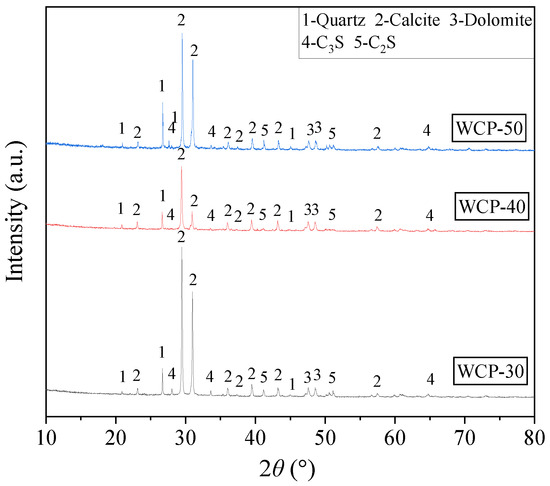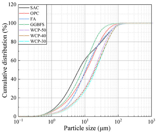 The WAFAs was fabricated using WCP, FA, GGBFS, OPC, and SAC as raw materials, as illustrated in Figure 1. The WCP includes three types (WCP-30, WCP-40, and WCP-50), which were obtained by crushing and screening shear wall specimens with target compressive strength grades of C30, C40, and C50 after testing. Among them, the C30 and C50 shear wall specimens were from the same batch and had been stored for 2 months, while the C40 specimens had been stored for 15 months. The FA used in this study was classified as Class F, Grade I, while the GGBFS was of S95 grade, supplied by Shunsheng New Environmental Building Materials Co., Ltd., Jincheng, China, and conformed to the specifications of ASTM C618 [30]. The OPC used in this study was P.O 42.5 grade, supplied by Tianrui Group Cement Co., Ltd., Zhengzhou, China. The SAC with a strength grade of 42.5 was obtained from Jianwen Special Material Technology Co., Ltd., Zhengzhou, China. Both materials met the specifications of the Chinese standard GB 175-2023 [31]. The particle size distribution of the raw materials was measured using a BT-9300HT laser particle size analyzer (Bettersize Instruments Ltd., Dandong, China), and the results are shown in Figure 2. The chemical compositions of the materials were determined using a Zetium X-ray fluorescence (XRF) spectrometer (PANalytical, Almelo, The Netherlands), and the results are summarized in Table 1. Furthermore, the X-ray diffraction (XRD) patterns of WCP, measured using a SmartLab SE diffractometer (Rigaku, Tokyo, Japan), are shown in Figure 3. The results reveal that the WCP reactivity decreases in the order of WCP-50 > WCP-30 > WCP-40. This phenomenon may be explained by the relatively shorter storage time of the C30 and C50 shear wall specimens, whereas the prolonged storage of the C40 specimens led to nearly complete hydration of the cement particles into C-S-H, resulting in the absence of detectable calcium silicate crystalline phases.