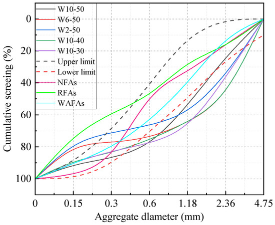Through multiple comparative tests evaluating the granulation state of WAFA, the best preparation procedure was established as follows: the weighed raw materials were sequentially added into the granulation drum and dry-mixed for 2 min to achieve uniform distribution. Then, the pre-measured water was sprayed into the drum for 1 min while simultaneously increasing the rotational speeds of the mixing blades and the granulation drum. The speeds were maintained until mixing was completed, with a total duration of 25 min. After granulation, the pellets were left to rest for 24 h and then subjected to water-sprinkling curing at room temperature. During the first 7 days, the pellets were sprinkled with water 3–4 times per day; thereafter, sprinkling was performed once every two days until 28 days. Based on extensive preliminary trials, the optimal granulation parameters for WAFA were determined as follows: a total dry raw material mass of 30 kg, a granulator inclination angle of 40°, a granulation-drum rotational speed of 12 rpm, and a mixing-blade rotational speed of 20 rpm. Under these conditions, WAFA pellets with particle sizes in the range of 0–4.75 mm were produced. The aggregates were subsequently sieved and recombined to obtain the target gradation prior to testing.
