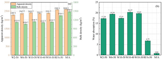 Physical properties of fine aggregates: (a) Apparent density and bulking density; (b) Saturated surface-dry water absorption.
