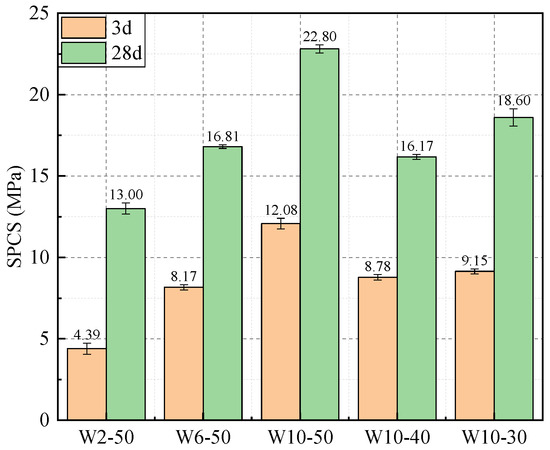 At curing ages of 3 and 28 days, ten particles with an average diameter of approximately 2 mm were selected to determine the SPCS of each WAFA sample. Outliers were removed, and the mean value was adopted as the final result. The loading rate of the testing machine was maintained at 0.6 mm/min. The SPCS was calculated according to the following Equation (1) [9,34,35].