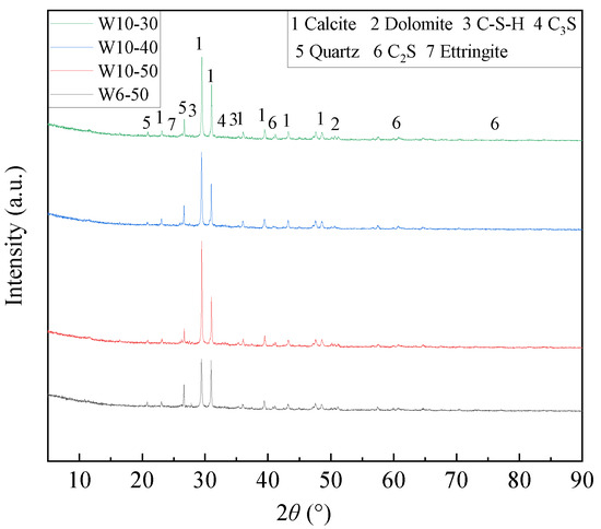 Figure 8 presents the XRD analysis results of different WAFAs. The main mineral phases of different WAFAs include Calcite (PDF#05-0586), Quartz (PDF#46-1045), and Dolomite (PDF#20-0452) [53], along with partially hydrated phases such as C-S-H (PDF#33-0306) and Ettringite (PDF#41-1451). Specifically, WAFAs with different cement contents (W6-50 and W10-50) both exhibit a prominent calcite diffraction peak at 2θ ≈ 29.4° and a broad C-S-H diffraction band within the 2θ = 25~35° range. However, the calcite peak intensity of W10-50 is significantly higher than that of W6-50, and more C-S-H phases are detected. This indicates that an increased cement dosage enhances the early release of Ca(OH)2 (CH), which reacts with the active SiO2 and Al2O3 in FA and GGBFS to form C-S-H and C-A-S-H gels [48]. The remaining CH subsequently reacts with atmospheric CO2 to produce CaCO3, thereby improving the overall cementitious degree and structural compactness of the system. Meanwhile, both W6-50 and W10-50 exhibit weak AFt peaks, confirming that a small amount of AFt is formed through the early reaction of SAC with gypsum.