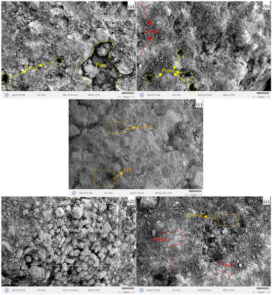 Figure 9 presents the SEM analysis results of W10-50, W10-40, W10-30, W6-50, and W0-50. It can be observed that W10-50 exhibits a more complete hydration process, with abundant hydration products such as C-S-H gels and AFt. The aggregate surface shows no visible pores or microcracks, which is one of the reasons for its superior physical and mechanical properties. In contrast, W10-40, W10-30, W6-50, and W0-50 exhibit a lower degree of hydration, resulting in fewer hydration products and limited gel-filling effects. Consequently, numerous pores and microcracks are present in these samples. Particularly for W0-50, almost no cementitious products are observed in the microstructure, and the particles appear loosely packed with many exposed surfaces. These differences are mainly attributed to the higher reactivity of WCP-50 compared with WCP-40 and WCP-30, which leads to the generation of more hydration products and a denser microstructure in W10-50. Moreover, due to its higher cement content compared with W6-50 and W0-50, W10-50 produces a larger quantity of hydration products, effectively refining its internal structure and enhancing overall compactness.