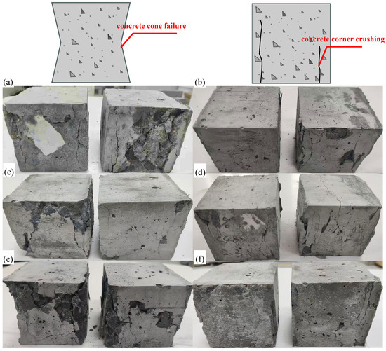 Compressive failure mode: (a) C50-NFA; (b) C50-RFA-50; (c) C30-W10-50; (d) C40-W10-50; (e) C50-W10-50; (f) C50-W6-50.