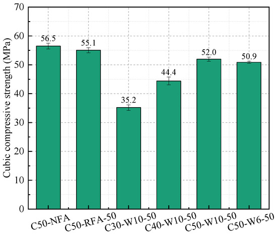 Figure 10 shows the slump test results of concretes prepared with different fine aggregates. It can be observed that the most exceptional case is C50-W2-50, which exhibited almost no slump. This finding supports the inference made in Section 3.1.2 that W2-50 contains numerous interconnected pores, leading to an underestimated saturated surface-dry water absorption during testing. Consequently, the additional water content calculated for C50-W2-50 during casting was inaccurate, resulting in nearly no workability; therefore, W2-50 was excluded from subsequent concrete casting. After removing the abnormal slump value of C50-W2-50, the workability of the remaining WAFA concretes was found to be relatively consistent. Compared with concretes made using other fine aggregates of the same strength grade, the slump values of WAFA concretes were all higher than those of NFA- and RFA-based concretes, among which C50-RFA-50 exhibited the lowest slump. This can be attributed to the spherical morphology of WAFA, which effectively reduces the friction between fine and coarse aggregates as well as among fine aggregate particles [9]. In addition, during mixing, the WAFA had not yet fully absorbed the additional water, allowing part of this water to act as mixing water, thereby improving concrete workability. In contrast, in C50-RFA-50, the angular shape of RFA-50 increases interparticle friction. Moreover, as shown in Table 4, particles smaller than 0.15 mm account for approximately 40% of RFA, and these fine powders adhere to the aggregate surface, increasing both the specific surface area and paste viscosity, which ultimately results in the lowest slump.