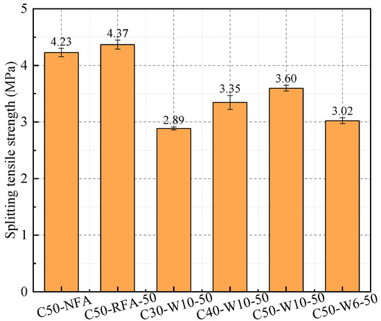 Figure 14 presents the 28-day splitting tensile strength of concretes incorporating different fine aggregates. Distinct variations are observed among the mixtures. For WAFA concretes, the splitting tensile strength of C30-W10-50, C40-W10-50, and C50-W10-50 increases with the designed strength grade. At the same strength level, C50-W6-50 exhibits a significantly lower splitting tensile strength than C50-W10-50. Among the C50 concretes incorporating different fine aggregates (C50-NFA, C50-RFA, and C50-W10-50), the C50-W10-50 mixture shows the lowest splitting tensile strength. The reason for this can be explained as follows: observations of the fracture surfaces show that during failure, the coarse aggregates, which serve as the primary bridges transmitting tensile stress [57], remain intact, while cracking occurs within the ITZ and the surrounding cement mortar [58]. In addition, fine aggregates embedded in the cement matrix also fracture, indicating that the tensile strength of the cement paste is lower than that of the coarse aggregates. Consequently, after debonding occurs at the ITZ, the fine aggregates and the surrounding paste jointly bear the applied tensile stress. Among the different fine aggregates, NFA consists of natural rock particles, RFA comprises rock particles coated with a small amount of old mortar, whereas WAFA is composed of spherical cement-based particles. Owing to their cementitious nature, the tensile strength of WAFA is considerably lower than that of NFA and RFA. As a result, WAFA is more susceptible to fracture under tensile stress. Therefore, at the macroscopic level, the splitting tensile strength of WAFA concrete is significantly lower than that of RFA and NFA concretes of the same strength grade.