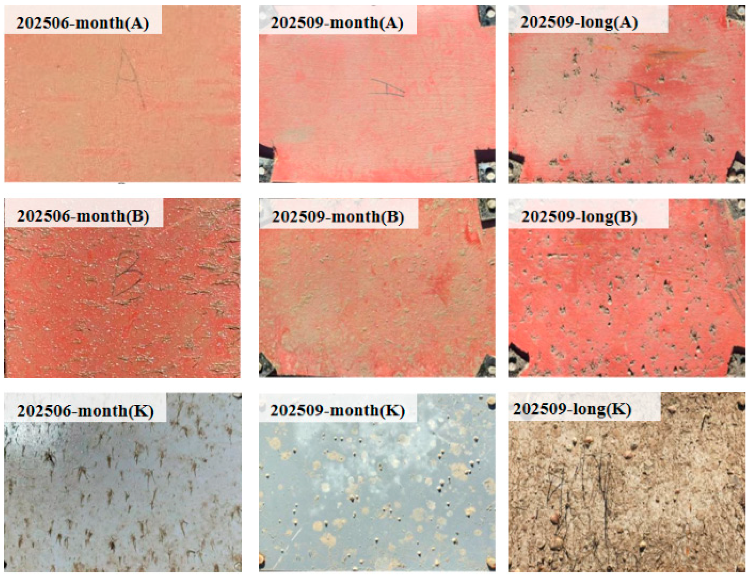 - GB/T 5370-2007; Method for Testing Antifouling Panels in Shallow Submergence. General Administration of Quality Supervision, Inspection and Quarantine of the People‘s Republic of China. Standardization Administration of the People’s Republic of China: Beijing, China, 2007.