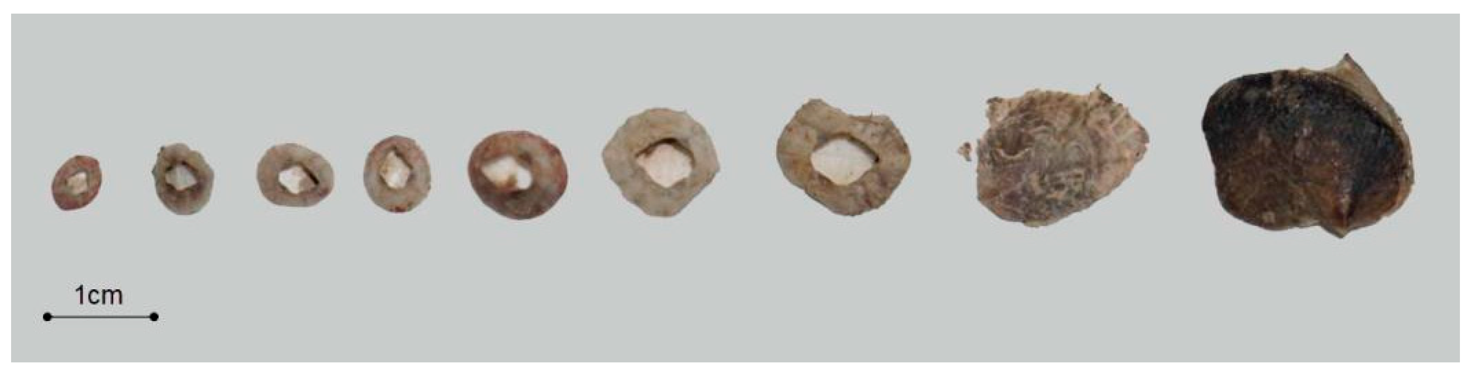 | No. | Species | L (mm) | B (mm) | Attachment Area (cm2) | Shell Dry Weight (g) | Carbonate Carbon Storage (g) |