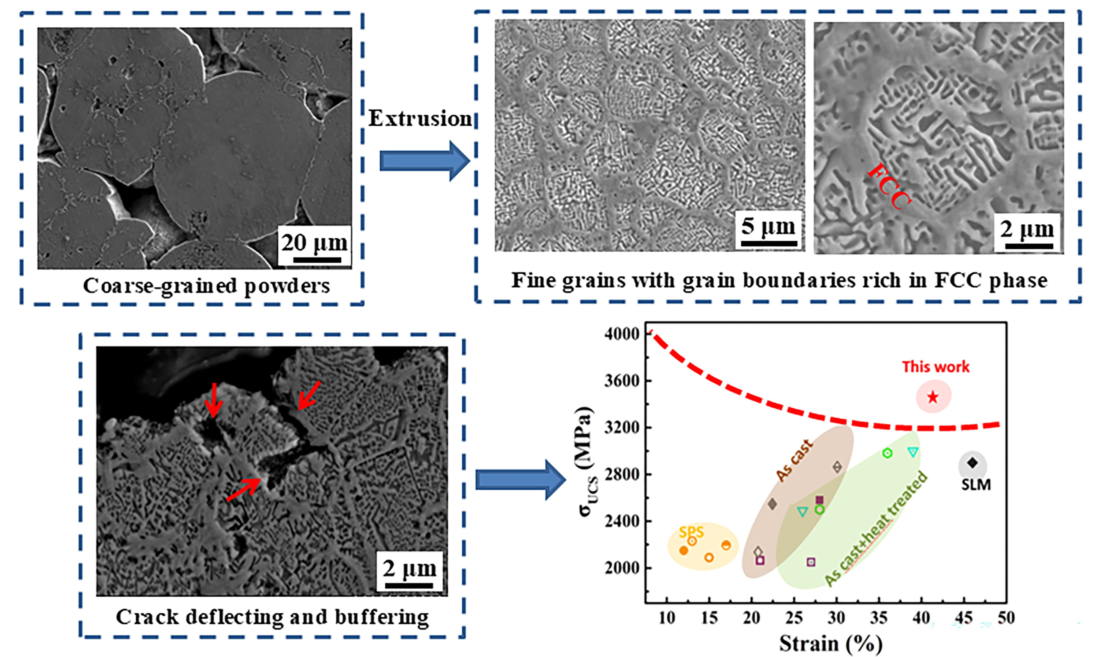 Figure 10b, the fine-grained AlCoCrFeNi HEA processed via SPS exhibits inferior mechanical properties compared to the as-extruded alloy developed in this work. The main reason for the performance deficit is primarily attributed to the presence of detrimental PPBs of the SPS material [