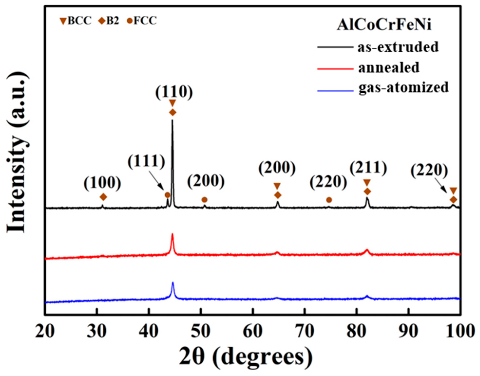 Figure 2 shows the XRD patterns of the atomized, annealed alloy powders and the as-extruded AlCoCrFeNi HEA. The atomized AlCoCrFeNi HEA powders consist of BCC/B2 phases [