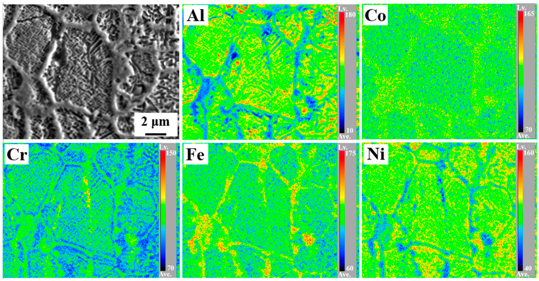 Figure 6 shows the BSE image and the corresponding EPMA elemental mappings of the extruded AlCoCrFeNi HEA. Elemental segregation can be found on the grain boundaries and interior of the equiaxed grains. The grain boundaries are enriched with Co, Cr, and Fe, while the grain matrix is enriched Al and Ni. However, no apparent elemental segregation is found in the powders after preheating (