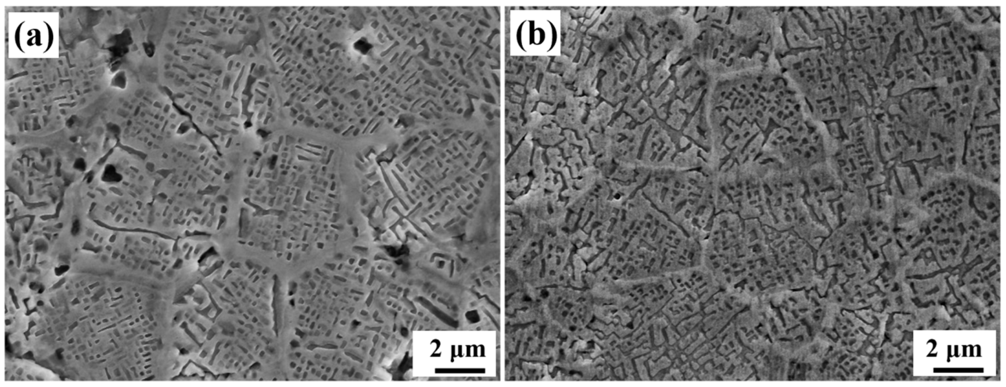 Figure 5 gives the SEM image of the alloy showing the microstructure in detail. It can be observed that the equiaxed grains of the alloy have thick grain boundaries rich in the FCC phase. The width of the grain boundaries is measured to be 0.5 μm. Within the grain, the dark gray and concave region is the BCC phase, while the light dark region is the B2 phase. As shown in