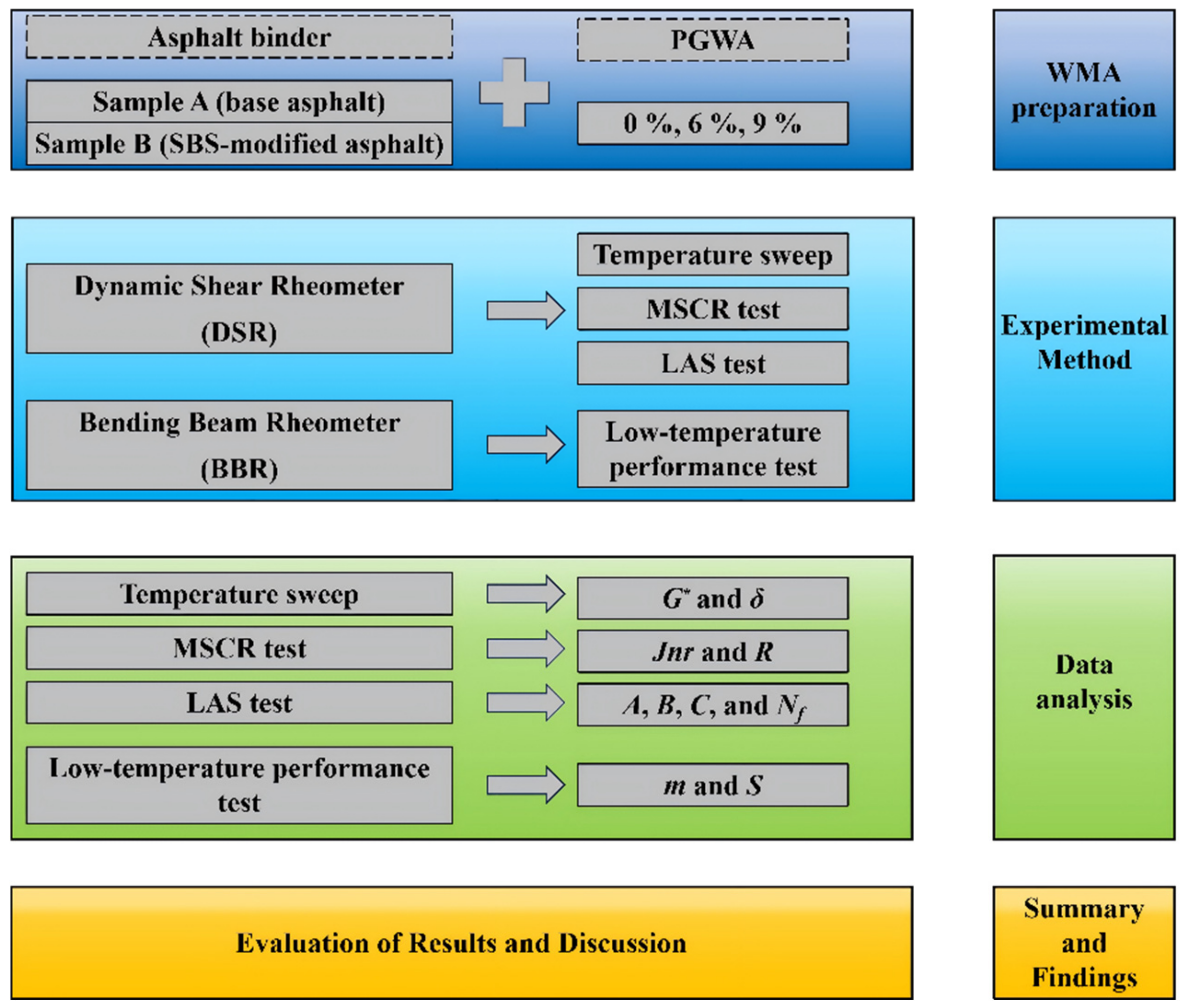 - With the addition of the PGWA, the yield stress of the asphalt gradually increases, while the variation in yield strain remains relatively small. Among the evaluated cumulative damage parameters, the base asphalt exhibits the lowest level of accumulated damage. Incorporating the PGWA enhances the ability of asphalt to withstand cumulative damage and improves the fatigue life.