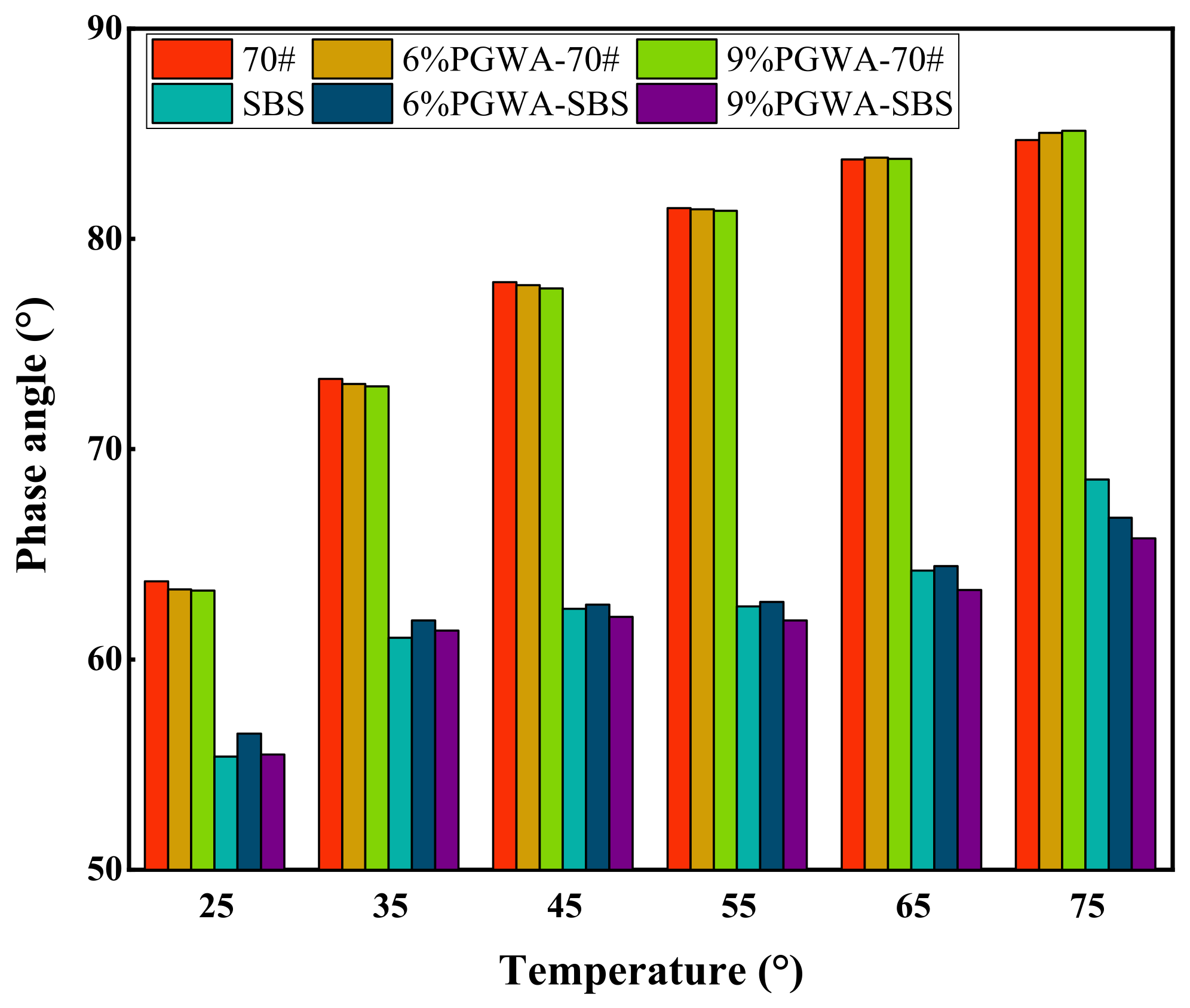 - The complex modulus of PGWA-added base asphalt is consistently higher than that of base asphalt, while the difference in phase angle remains small. The SBS modifier provides a more pronounced improvement in high-temperature performance than the PGWA, leading to a substantial increase in complex modulus. Meanwhile, the PGWA maintains a relatively stable proportion between the viscous and elastic components of the asphalt.