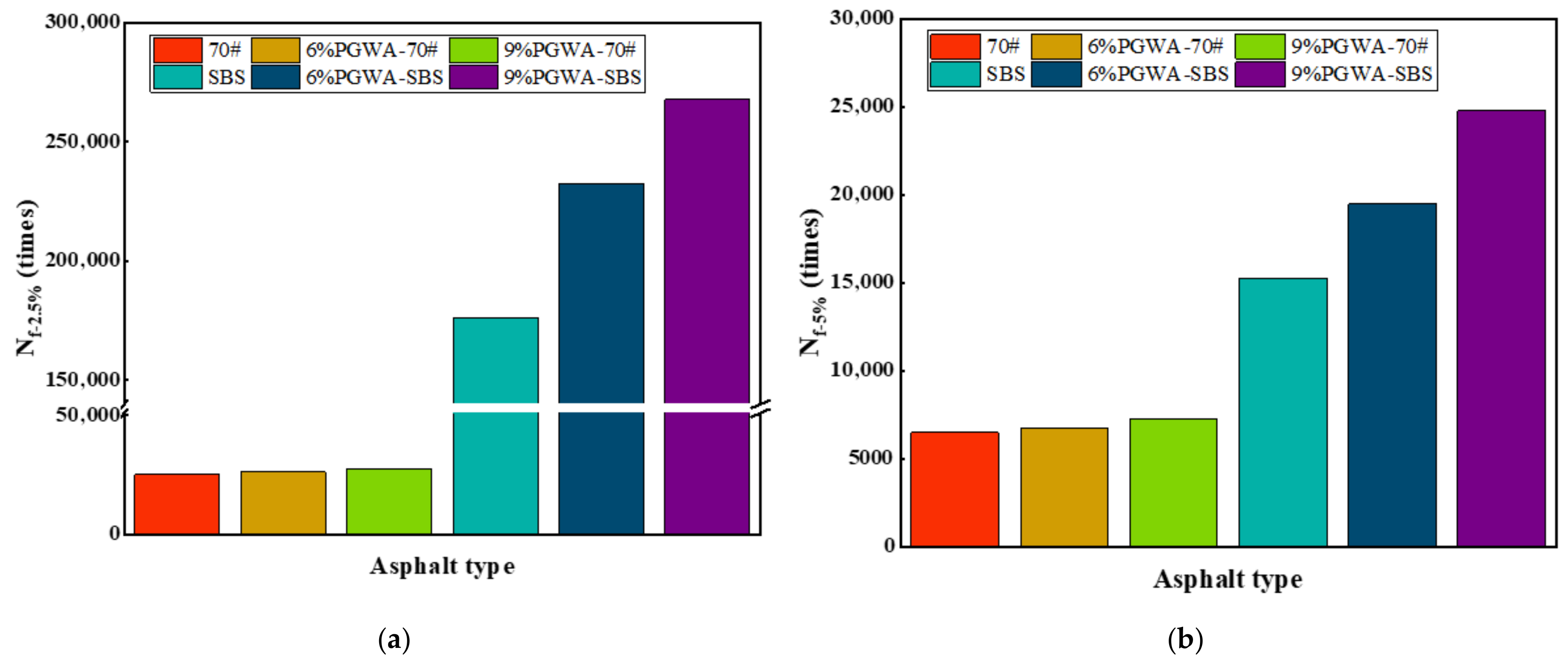 4.3. Fatigue Performance of PGWA-Added Asphalt