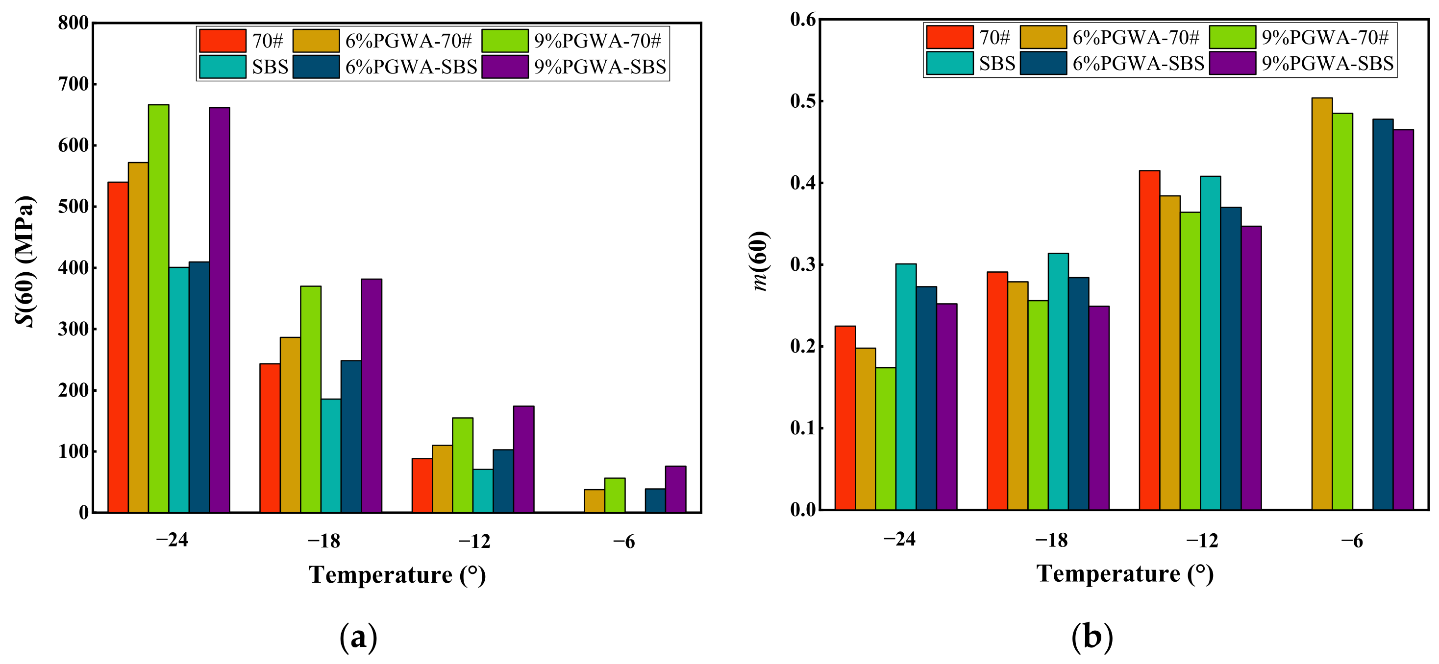 4.4.2. Low-Temperature Performance Analysis Based on Burgers Model