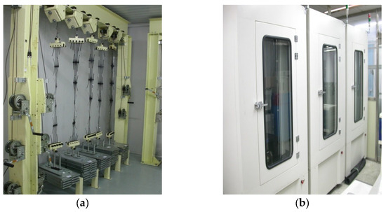 The conventional creep tests were conducted in accordance with ISO 13431. The conventional creep test equipment is illustrated in Figure 2a. Each specimen was loaded under a constant tensile load while being maintained in temperature-controlled chambers set at 20, 30, 40, and 50 °C (±1 °C). A total of 75 test stations were used, and each specimen had a gauge length of approximately 750 mm. For each test temperature, multiple specimens were subjected to creep loads corresponding to 40–60% of the ultimate tensile strength (UTS). Creep strain was recorded continuously or at fixed intervals until one of the following conditions was reached: (i) the specimen achieved 20% creep strain, or (ii) creep rupture occurred. Because the temperature remained constant throughout each individual test, the conventional creep method provides true long-term creep behavior without thermal disturbance, and thus serves as the baseline for evaluating accelerated methods.