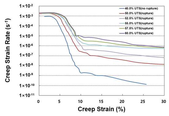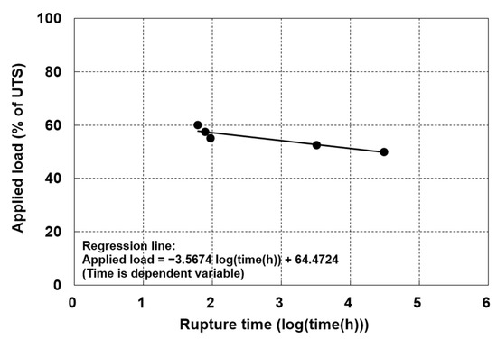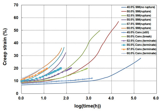 SIM master curves were obtained at six levels of applied load ranging from 40% and 60% of the UTS. The corresponding results are summarized in Table 3. As indicated, creep rupture began to occur at an applied load of 50%, and the creep strains at rupture ranged from 28.7% to 53.8% under applied loads of 50–60%.