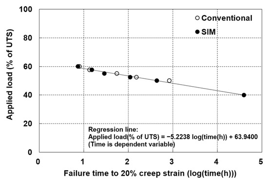 The data after block shifting are presented in Figure 7c, wherein it can be seen that the data overlaps allow for the accurate positioning of each dataset relative to the one above. From the regression line of the data shown in Figure 7c, the creep strength of the tested product was calculated as 41.1% of its UTS. Moreover, from Figure 7c and Table 5, the RFCR value based on a 20% creep strain at a 100-year design life was determined to be 2.43, which is lower than the value of 3.04 obtained from conventional and SIM testing.