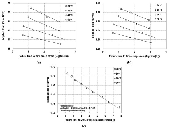 (a) Log(time)–applied load relationships, (b) log(time)–log(load) relationships, and (c) log(time)–log(load) relationships after block shifting. All relationships were evaluated at various temperatures under 20% creep strain.
