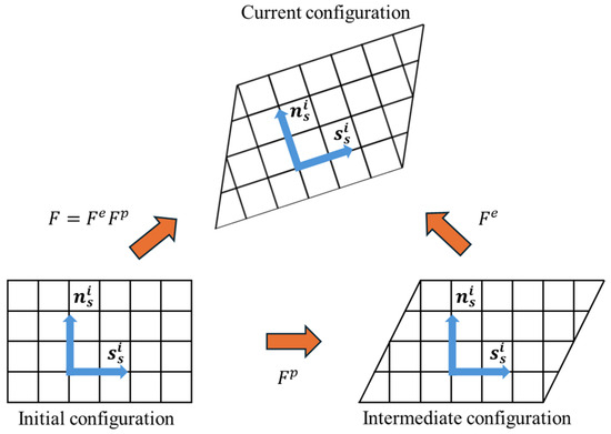 The plastic deformation gradient is obtained through the integration of the shear strain rates on the respective slip systems . For a crystal possessing slip systems, it is calculated using the following formula [16,17]: