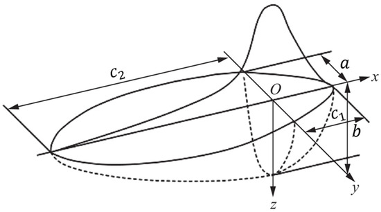 During the EBW process, the temperature gradient is steep in front of the heat source center, while the gradient change at the rear tends to be gentler. Based on these heat source characteristics, the heat source model for the weld joint region adopts the double-ellipsoidal model proposed by Goldak [21]. As illustrated in Figure 4, this model’s heat flux exhibits a Gaussian distribution along the longitudinal axis. The model assumes that the front half of the heat source model is one-quarter of an ellipsoid, and the rear half is another one-quarter of an ellipsoid. The power density distribution for the front ellipsoid is as follows: