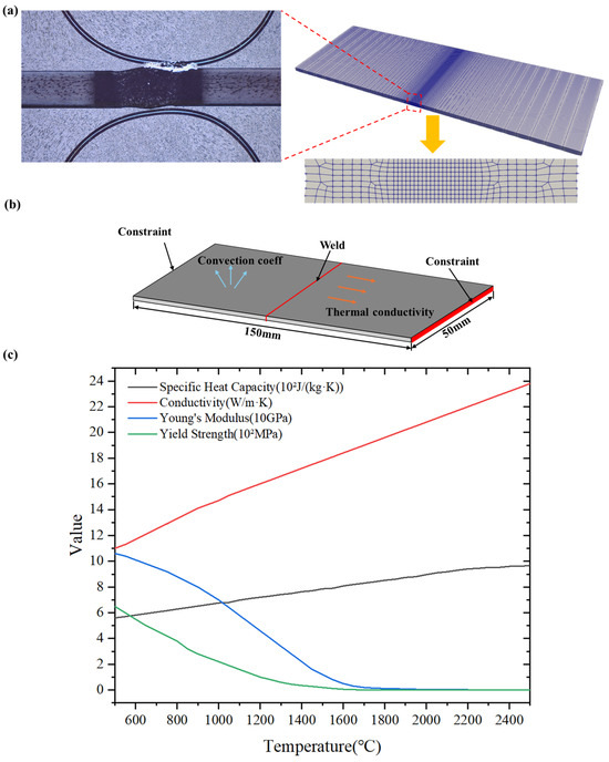 (a) Grid division strategy diagram; (b) Simulation parameter settings and constraint positions; (c) Thermo-elasto-plasticity parameters varying with temperature.