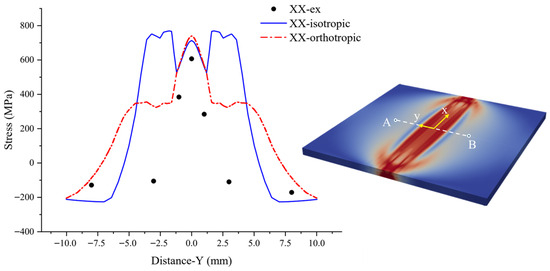 Figure 8 presents a comparative validation between the finite element simulation results and the experimental measurements of welding residual stress. It is important to note that the data depicts the surface residual stress distributions along the transverse line segment AB (perpendicular to the welding direction on the surface). Specifically, the discrete data points labeled ‘XX-ex’ represent the experimental measurements; the curves ‘XX-isotropic’ denote the numerical simulation results based on the isotropic constitutive model; and the curves ‘XX-orthotropic’ correspond to the numerical simulation results derived from the elastic-plastic orthotropic constitutive model. Given that the RVE in Section 3.2 was constructed based on EBSD data from the weld center region, to ensure consistency between the simulation conditions and the experimental conditions, the interval of −10 mm Y 10 mm was selected for analysis.