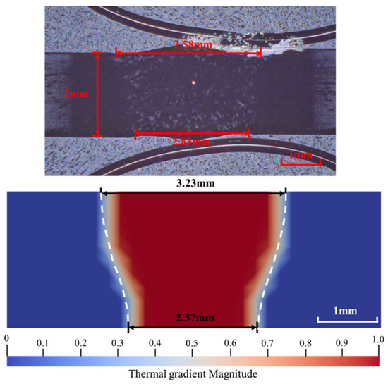 In the experimental welding, the welding input power was 950 W, and the welding torch moving speed was 30 mm/s. The post-weld cross-section is shown in Figure 7a; measurements indicated a weld seam width of approximately 2 mm and a heat-affected zone width of approximately 7 mm.
