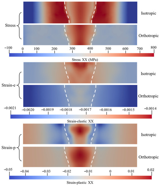 Comparison of stress and strain maps in orthogonal anisotropic and isotropic weld regions along XZ.