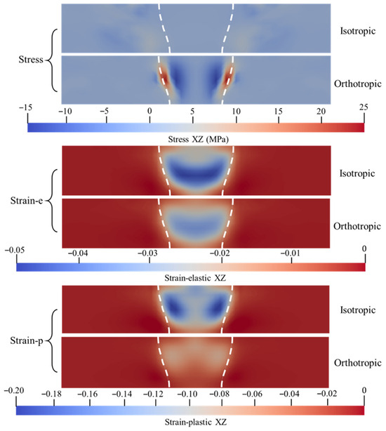 Based on the yield data presented in Figure 6, the XZ shear plane exhibits the lowest yield threshold, making it the preferred orientation for the initiation of plastic slip. Given the high sensitivity of this direction to plastic flow, the XZ direction was selected to analyze the significant discrepancies in the mechanical response predictions between the orthotropic and isotropic models.