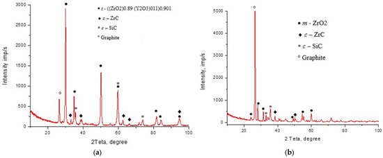 XRD diagram of the composite ZrO2−3 wt% Y2O3–10 wt% SiC, sintered at temperature Tsint = 1400 °Cfor different holding times: (a) th = 3 min; (b) th = 10 min.