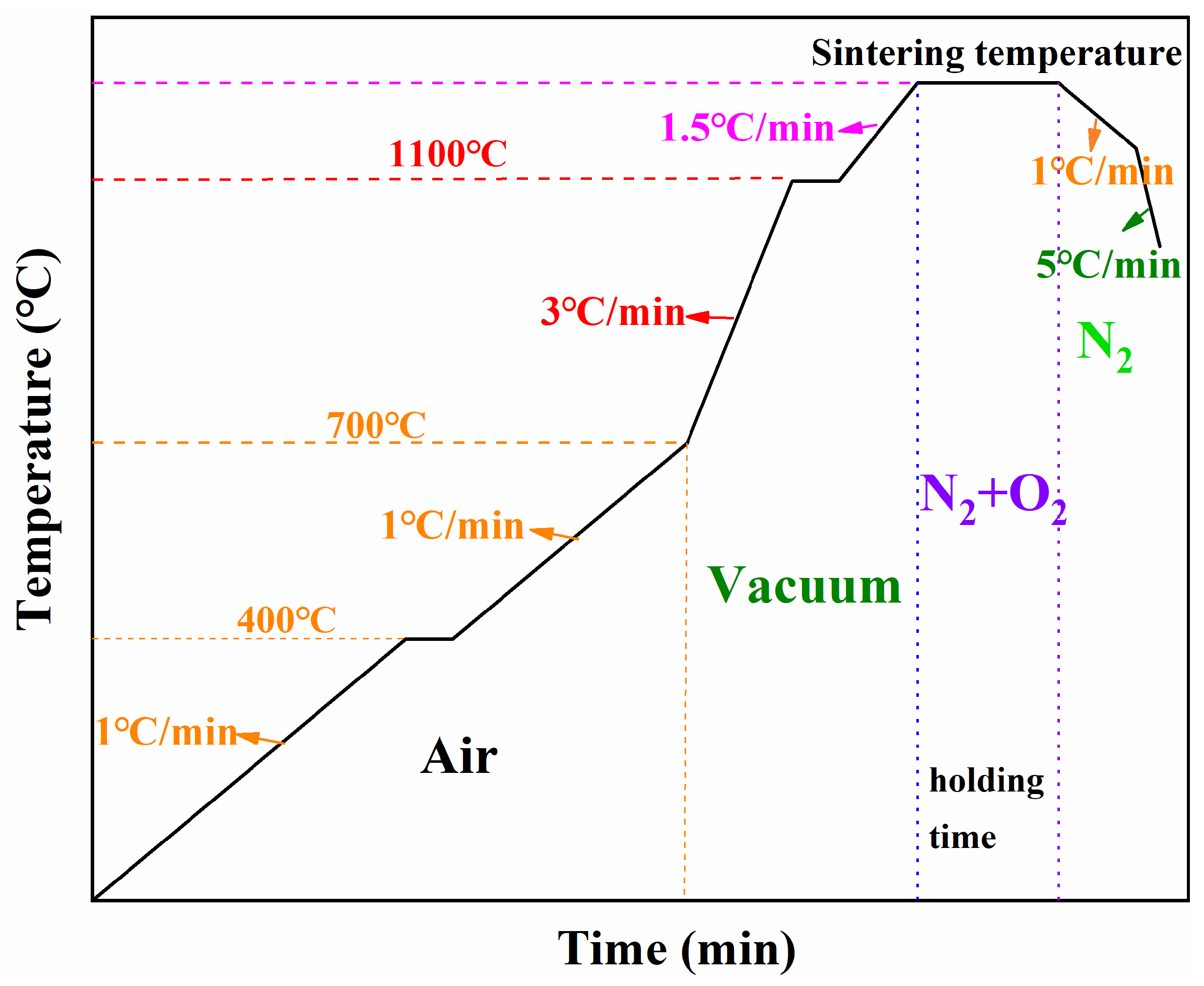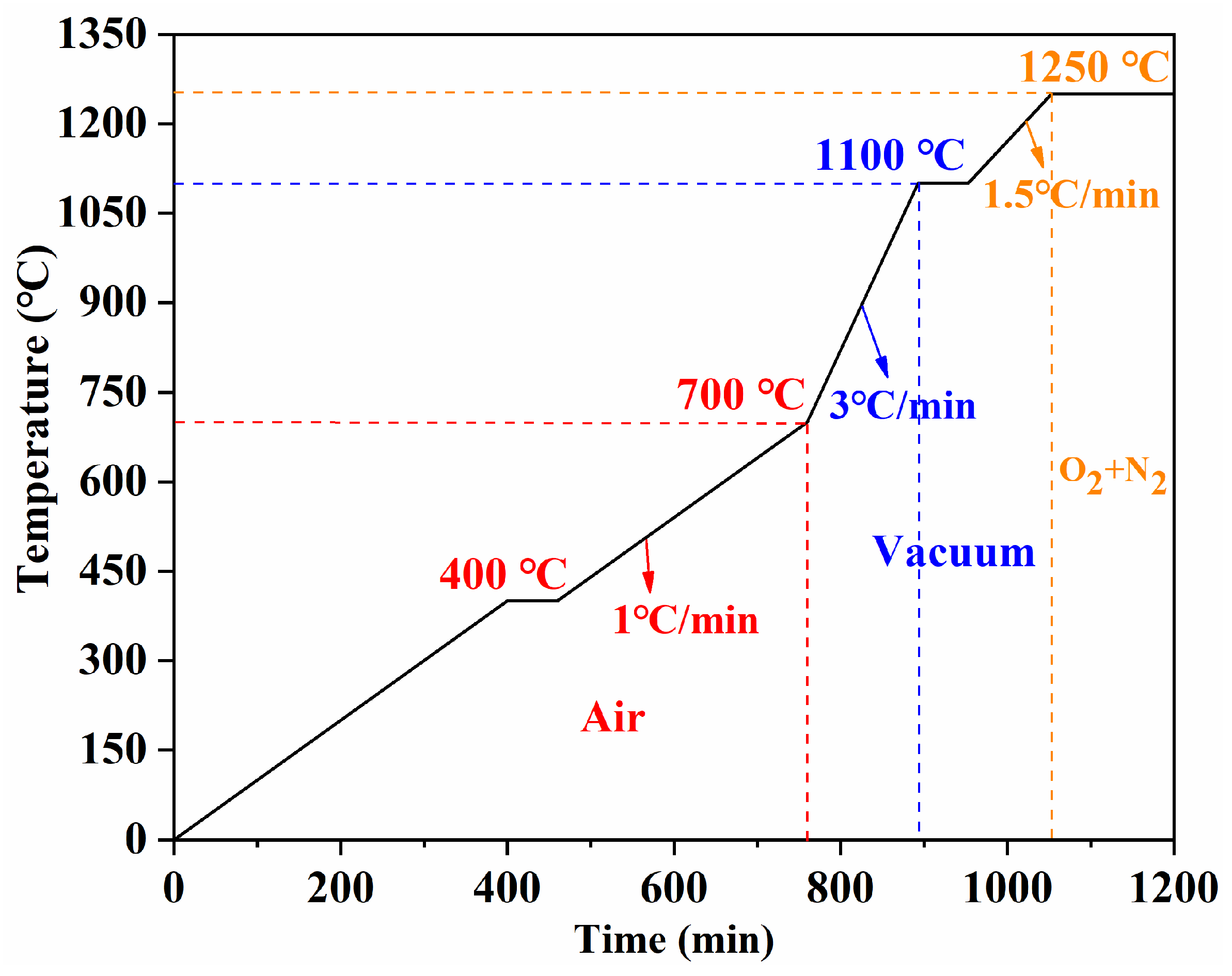 Figure 12 shows the optimised sintering scheme used as the reference condition. Green toroidal compacts were heated to 400 °C, 700 °C, 900 °C, 1000 °C, 1100 °C, and 1250 °C as key sampling temperatures, and additional specimens were held at 1250 °C for different times (1 h and 3 h). The corresponding samples were denoted as S-400, S-700, S-900, S-1000, S-1100, S-1250, S-1250-1, and S-1250-3, respectively.