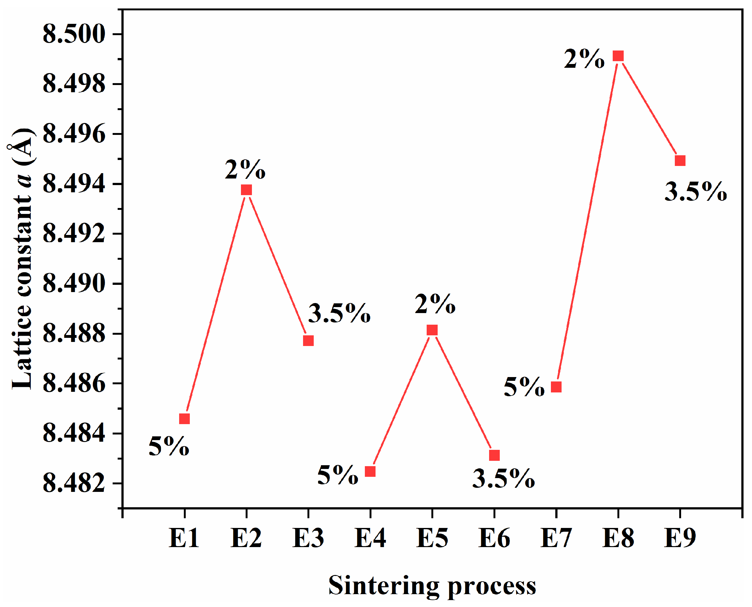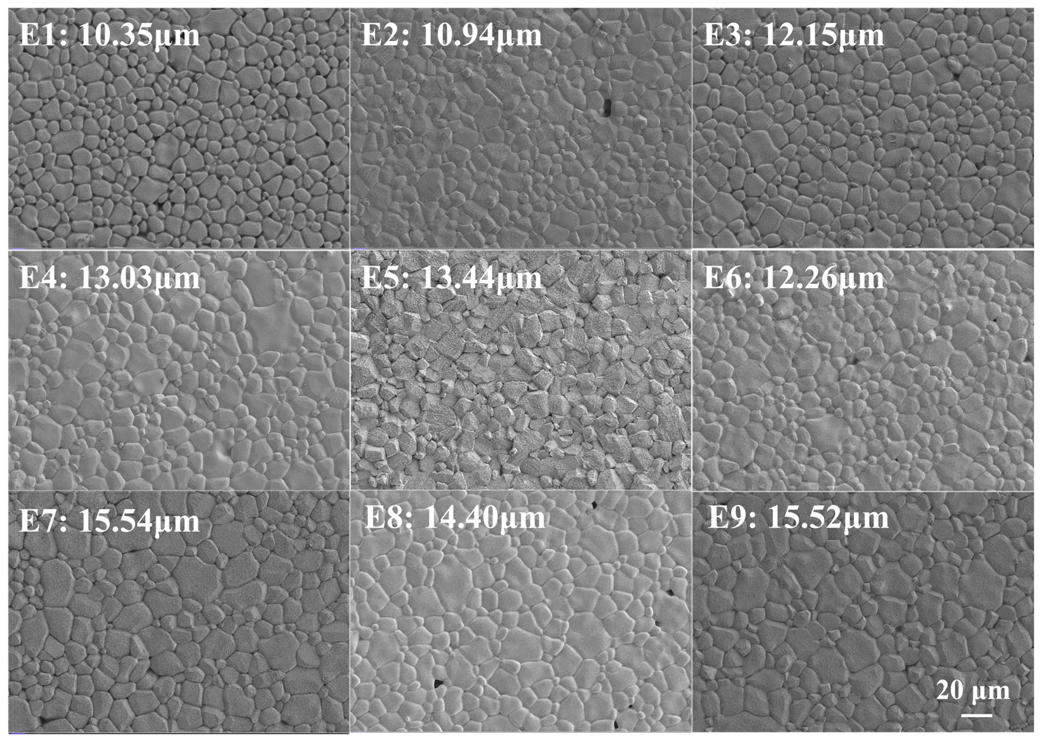 In summary, the relative importance of the three factors affecting µi can be ranked as: oxygen partial pressure > sintering temperature > holding time. Consistent with this ranking, µi reached a maximum at an intermediate oxygen partial pressure (3.5% ) compared with 2% or 5% . In MnZn spinel ferrites, the sintering atmosphere may modify the defect chemistry and redox equilibrium, which can affect magnetic softness through changes in magnetocrystalline anisotropy, magnetostriction and internal stress. However, because Ms, K1, and the Fe2+/Fe3+ ratio were not quantitatively determined for all E1–E9 samples, the atmosphere-related interactions in this work are qualitative, and we therefore focus on experimentally observable structure–property correlations.